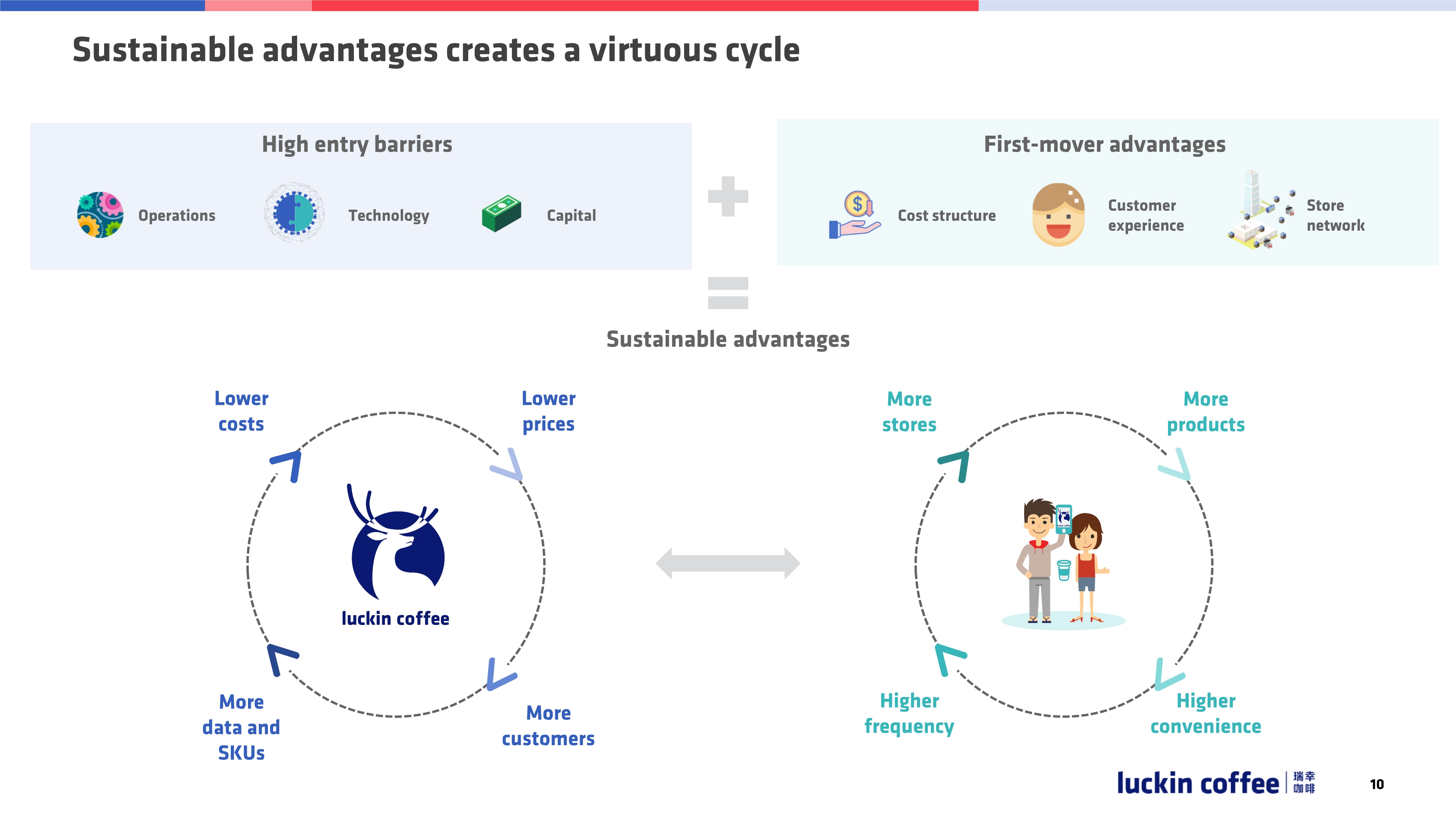 可持续的竞争优势带来业务的良性循环。高进入门槛(运营、技术、资金)+唯快不破(先发优势优势带来成本结构,用户体验,店铺网络规模),这两个加起来就是可持续的竞争优势。