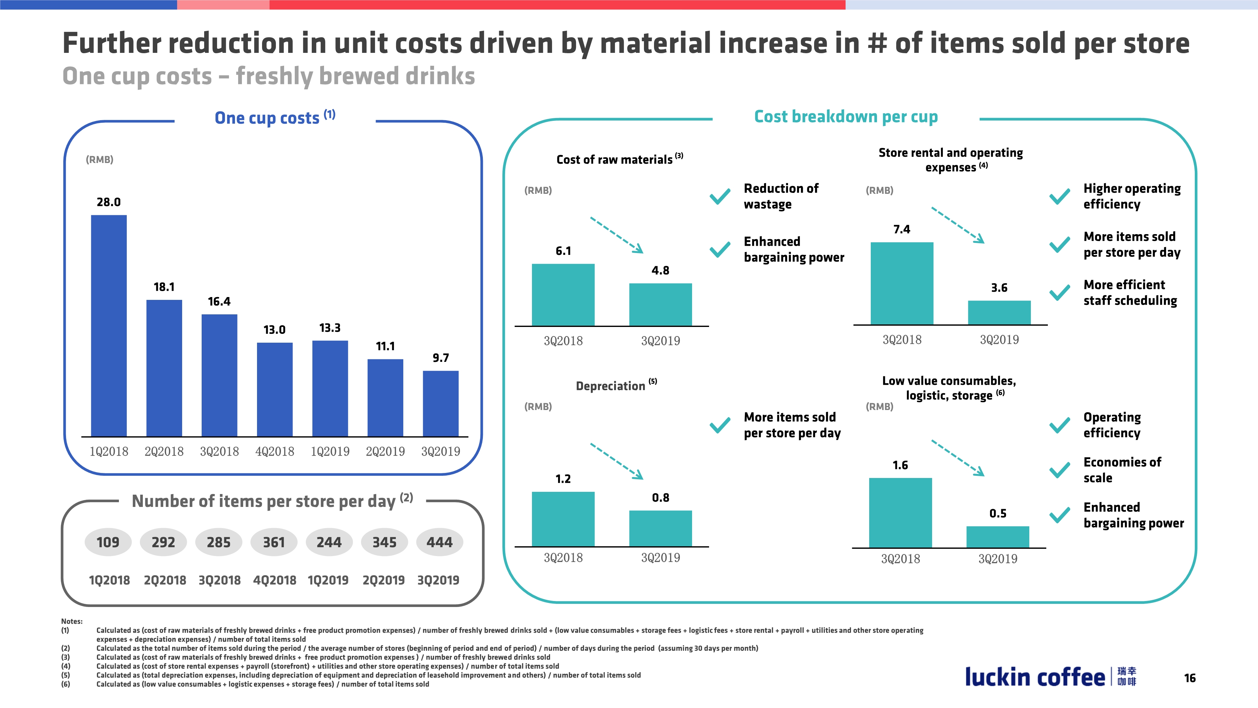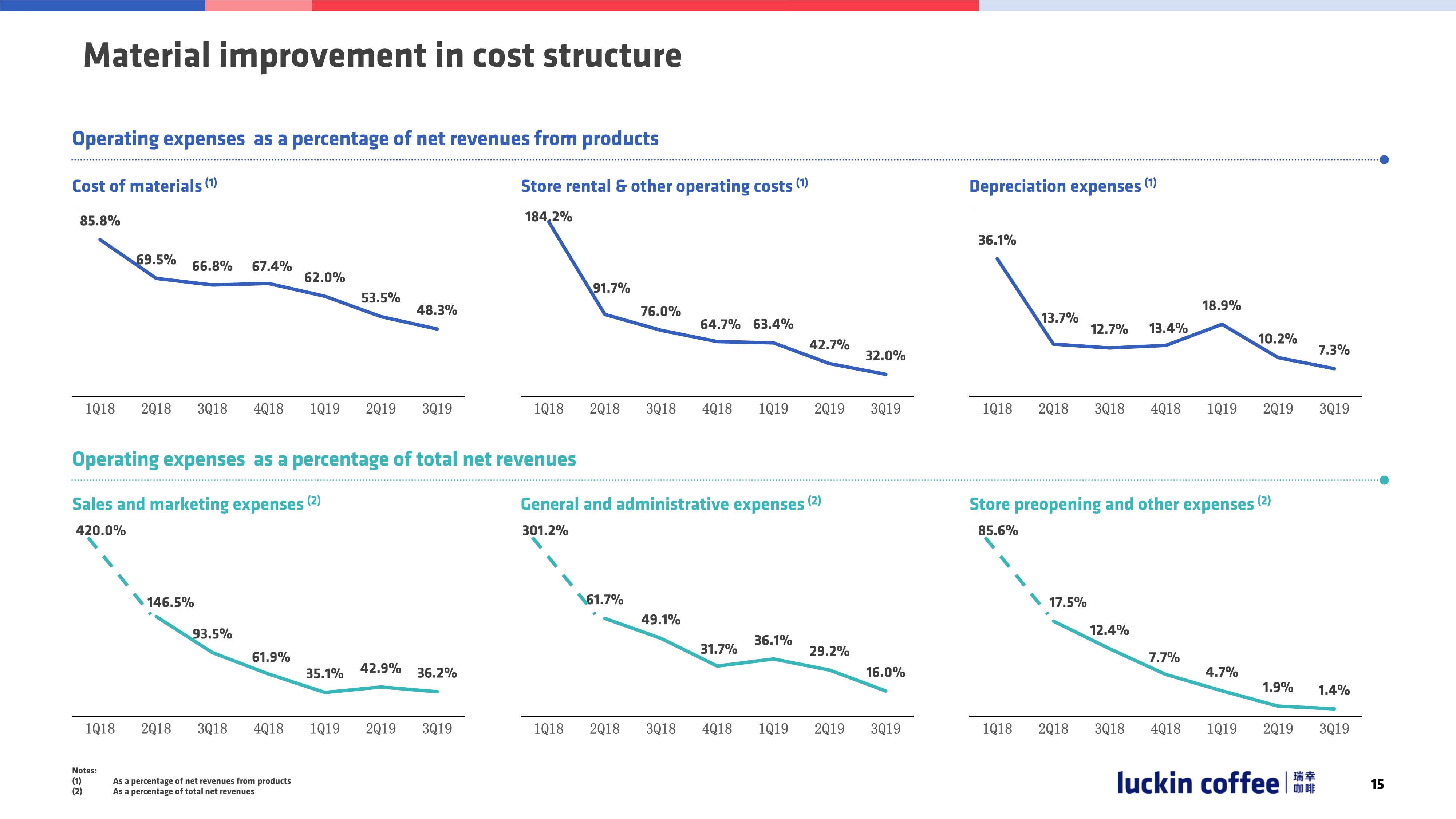 成本结构有了实质性的提高:包括物料费用的下降,店铺租金和运营成本占比的下降,折旧费用占比下降等。