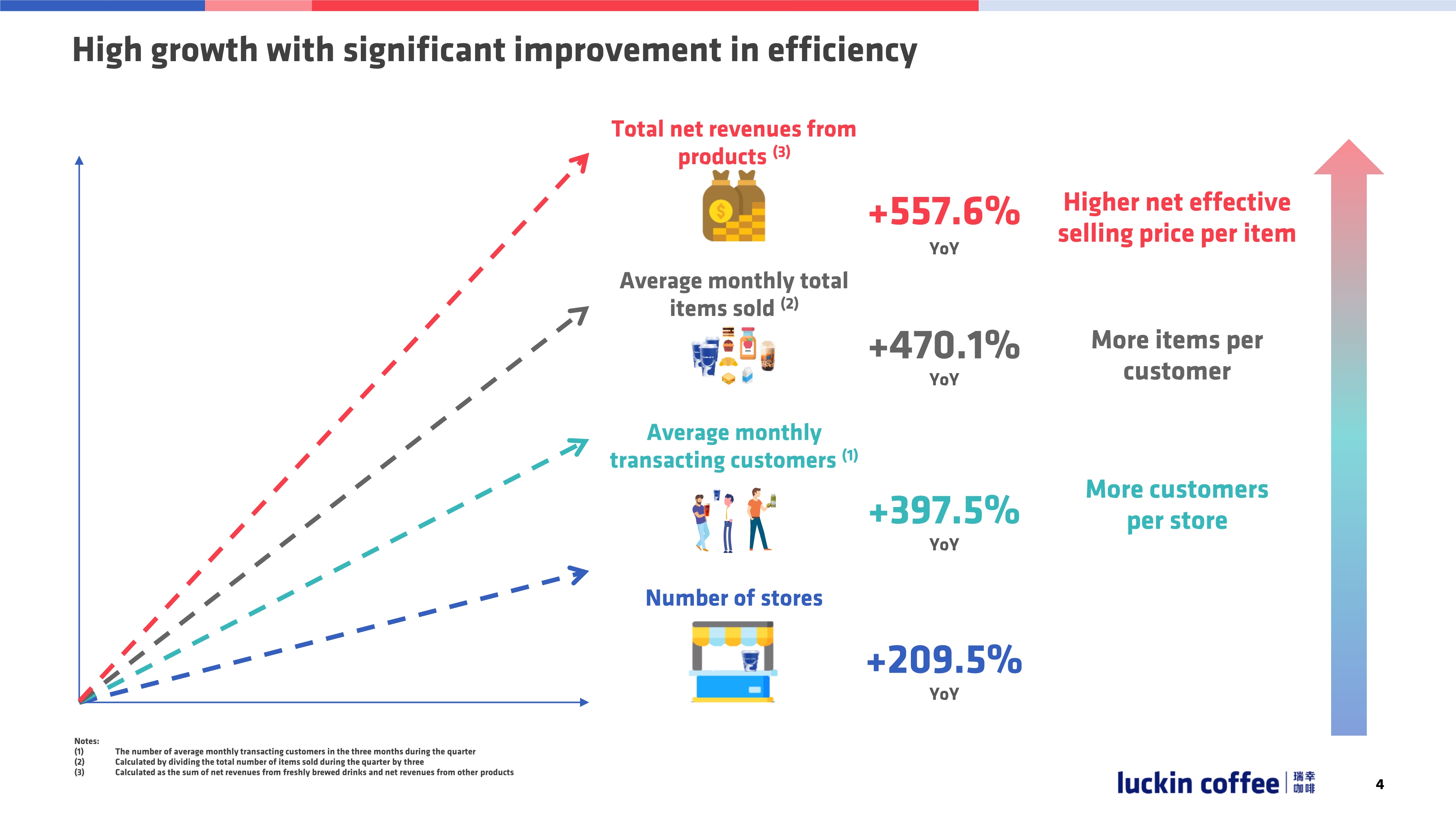 高速增长的同时是运营效率的显著提升。看这PPT,营收增速超过卖出去的商品数增速,售卖的商品数增速超过客户数增速,客户数增长超过门店数增速。