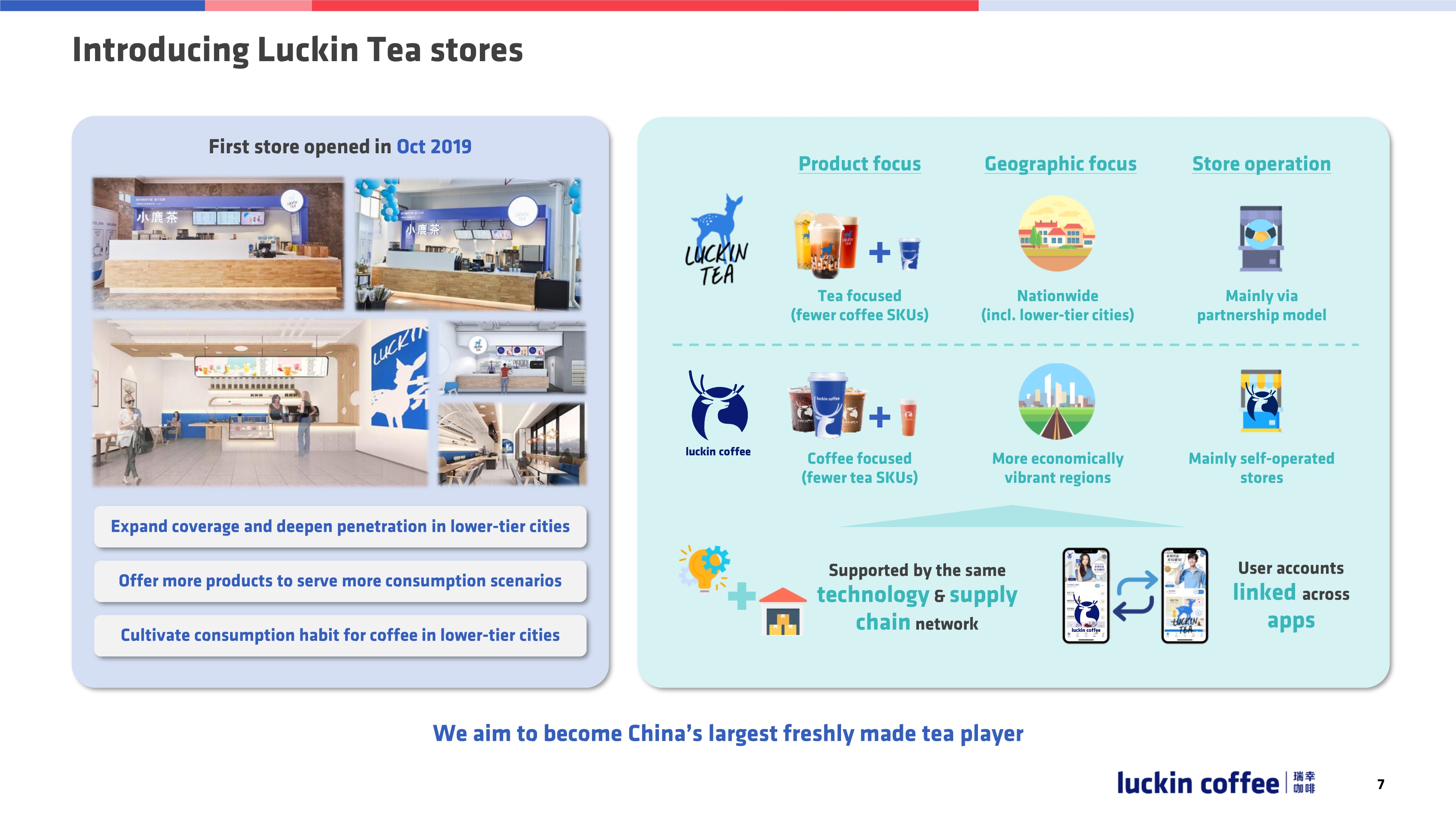 小鹿茶门店跟咖啡门店不同在三点:1 咖啡门店咖啡SKU更多,茶的SKU少,茶的门店茶SKU更多,咖啡SKU更少;2、咖啡门店主要覆盖1-2线城市,小鹿茶将覆盖整个中国;3、咖啡门店主要自营,小鹿茶门店合作运营居多。小鹿茶和咖啡的APP互通,运营使用同一套系统。