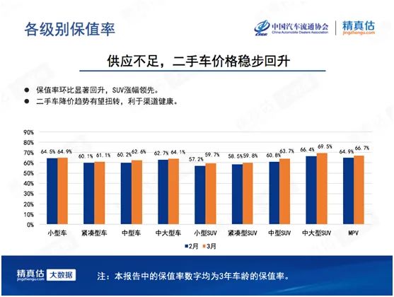 无论是疫情因素还是春节因素,或是产能因素,最终反映在价格上都是供需关系导致价格变动。由于二手车源供应减少,各个级别的车型价格都有上涨,且涨幅较大。保值率逐年下滑的趋势,有望在2020年得到扭转。长期来看,价格上升有利于渠道健康,也有利于提高服务质量。