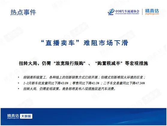 自疫情发生以来,厂商、经销商首先是开展自救。汽车产业是很难“线上办公”的,即便我们的销售顾问都开始“直播”了,但完成订单仍需客户到店。虽然“玩”出了一些花样,结果仍杯水车薪。从1月至2月已经公开发布的数字来看,多个指标全面下降。对消费者来说,购车是一个长周期的决策,如果我们寄希望于销量在二季度恢复,须有宏观政策介入。直播效果尚待观察。