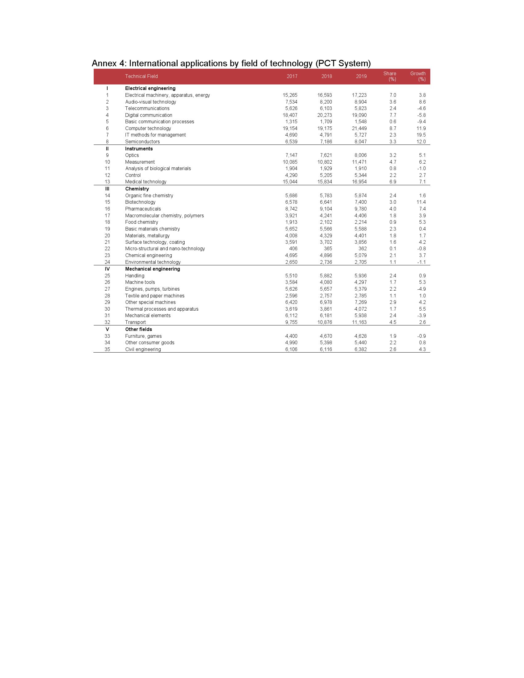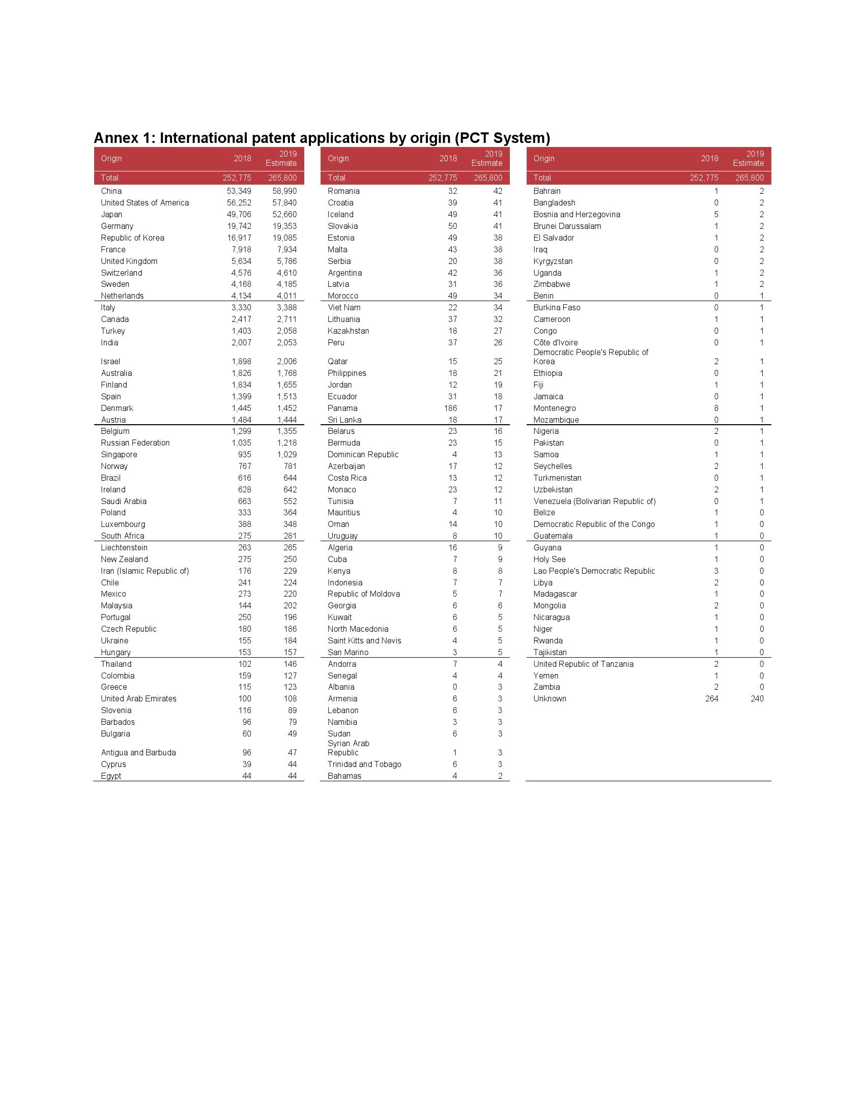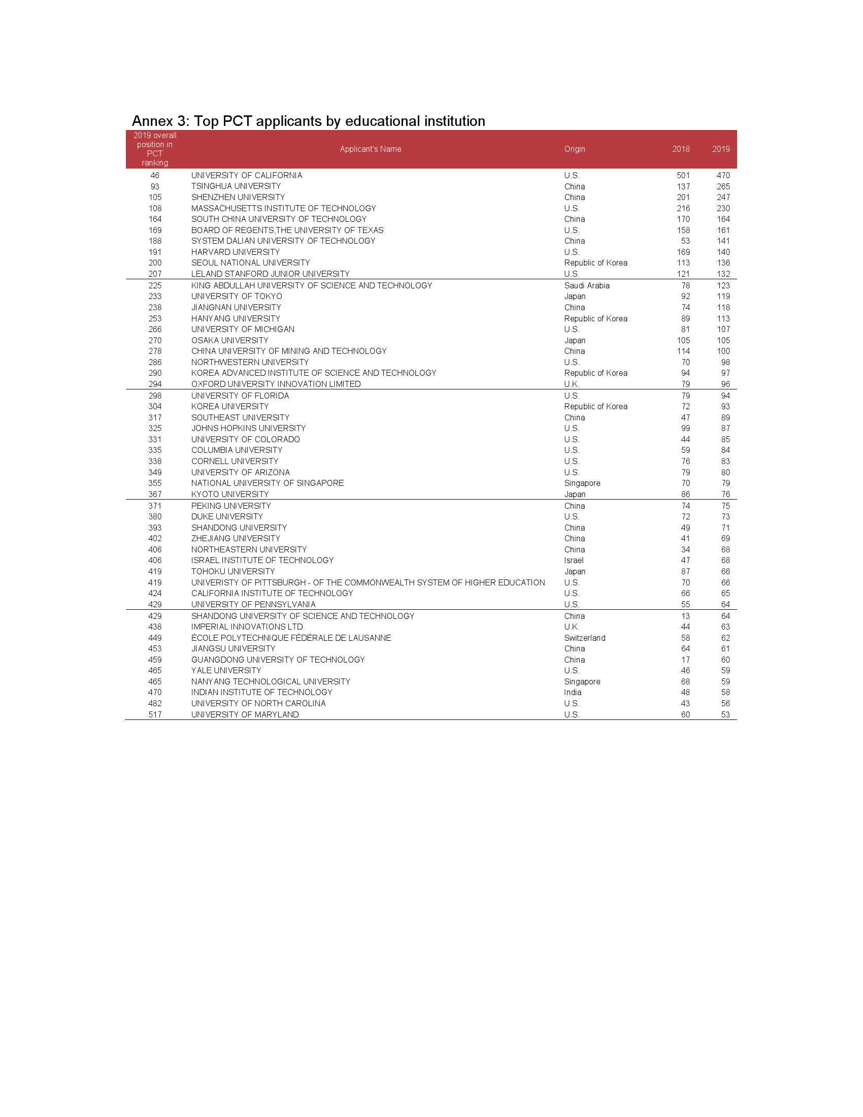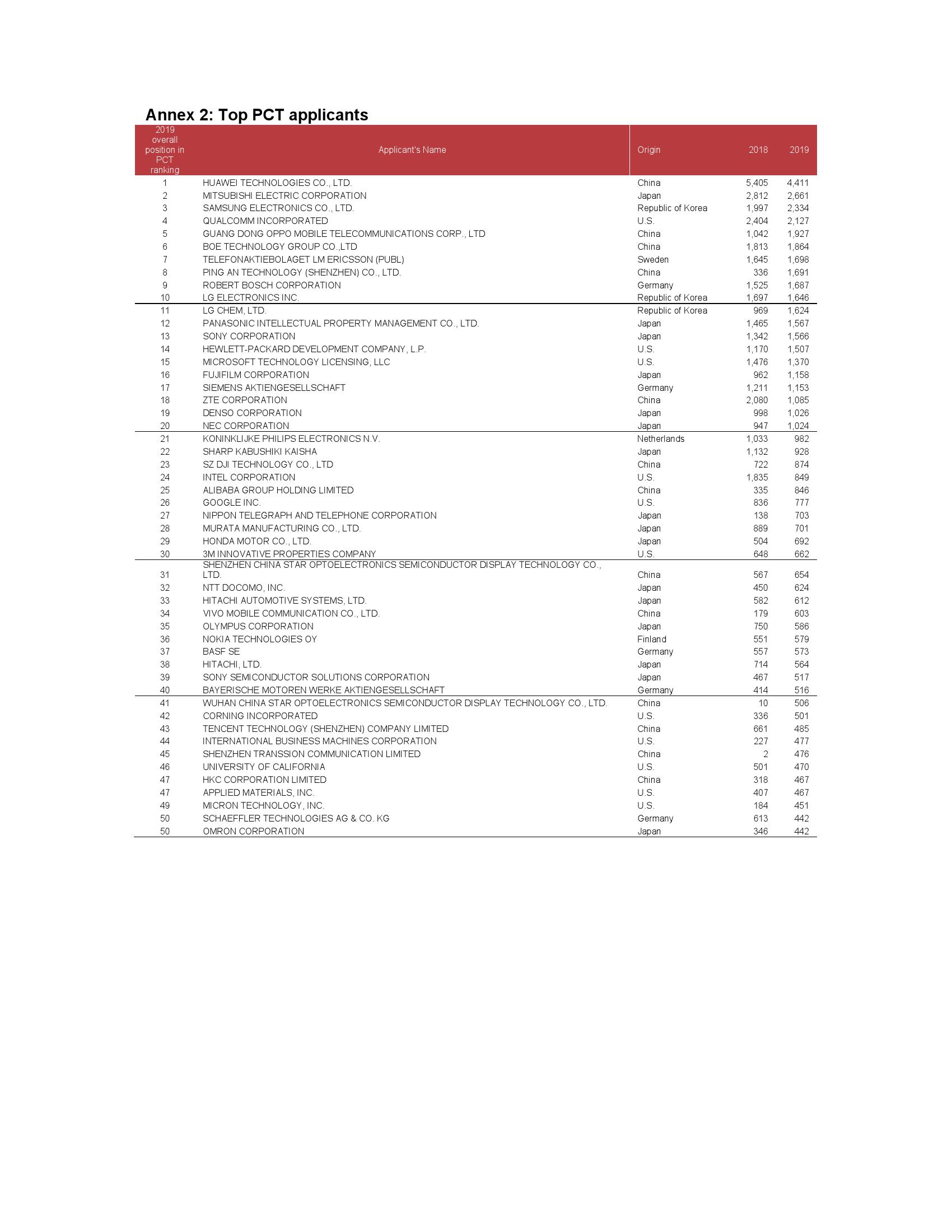 2019年,中国通过PCT体系提交了58990件申请,年增长率为10.6%,成为该体系的最大用户。自1978年PCT体系投入运作以来,美国此前均居榜首,2019年该国以57840件申请位列第二。WIPO总干事弗朗西斯·高锐表示,中国迅速跃升至首位,这突出表明,长期以来,创新地理格局在向东方转移,亚洲申请人提交的申请现已占全部申请的半数以上。