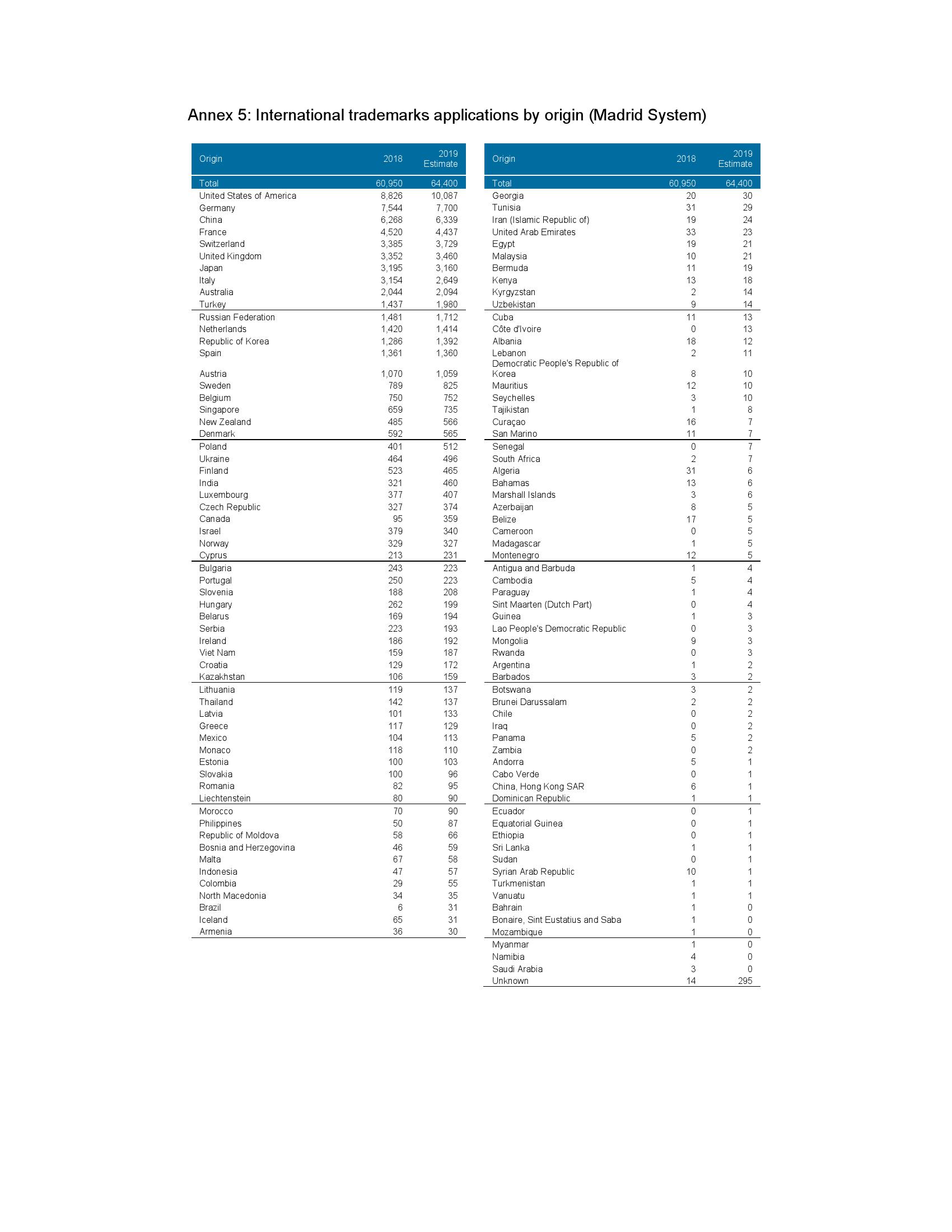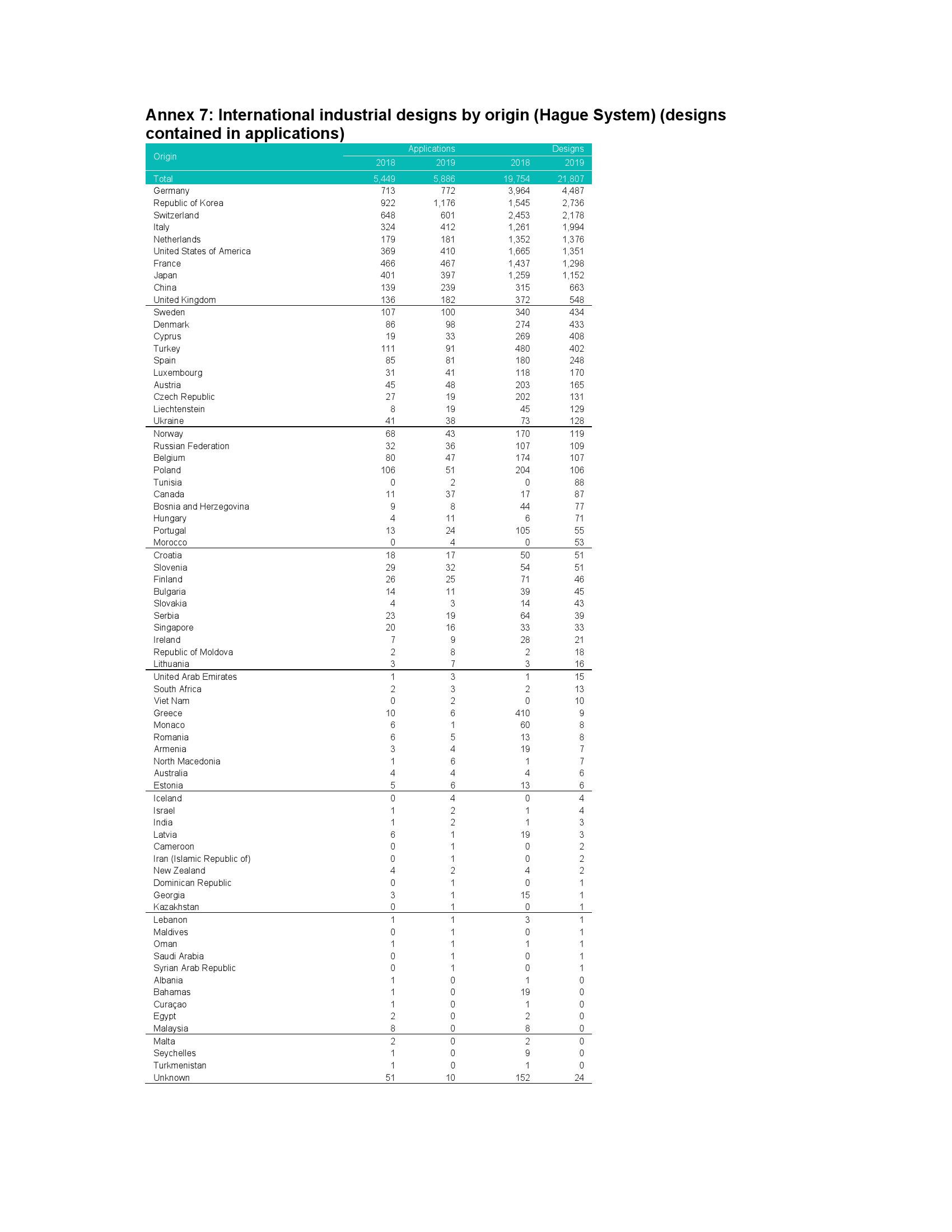 数据显示,2019年,通过《专利合作条约》(PCT)提交的国际专利申请量为265800件,增长率为5.2%;通过商标国际注册马德里体系提交的国际商标申请量为64400件,增长率为5.7%;通过工业品外观设计国际注册海牙体系为工业品外观设计寻求保护的数量为21807项,增长率为10.4%。