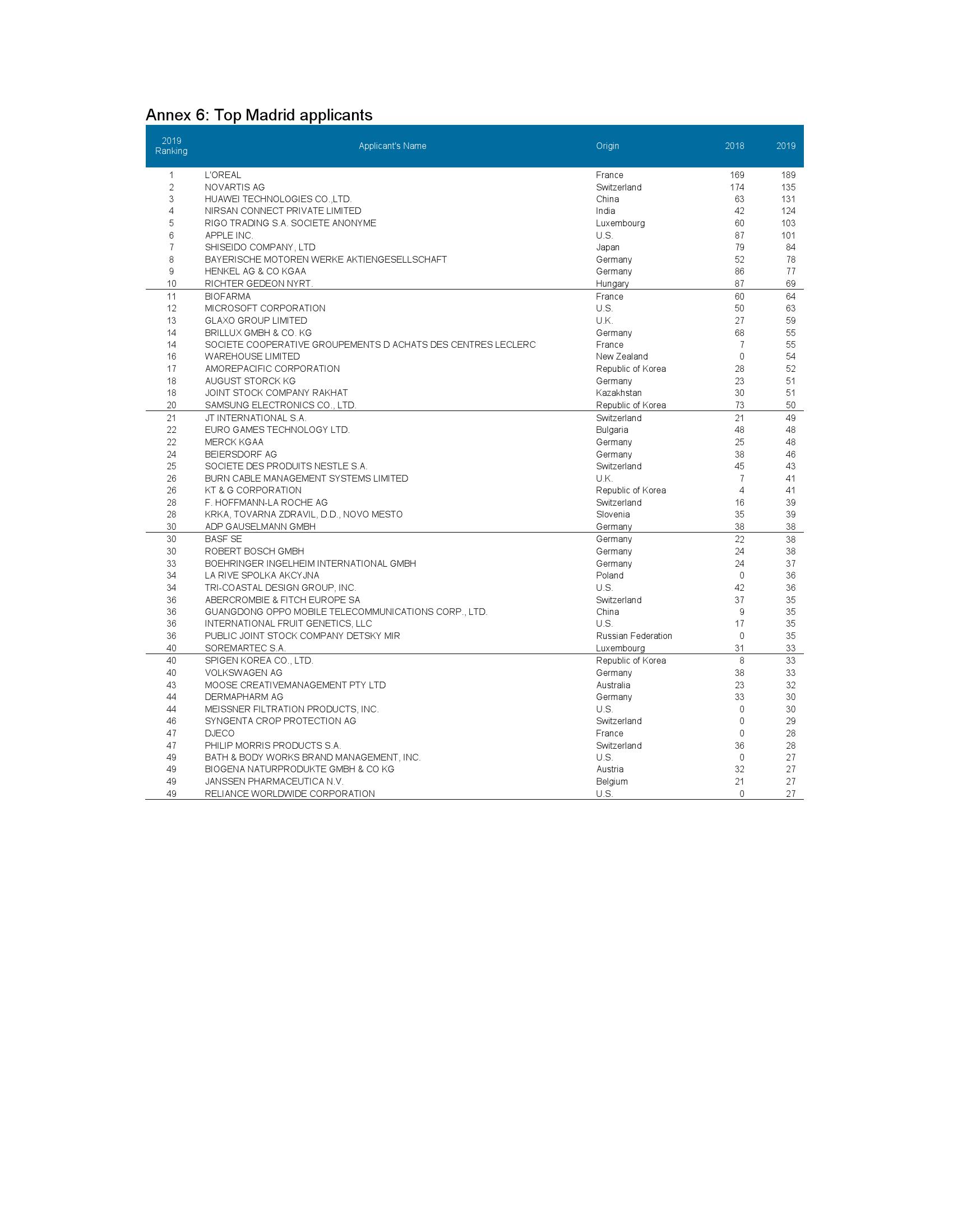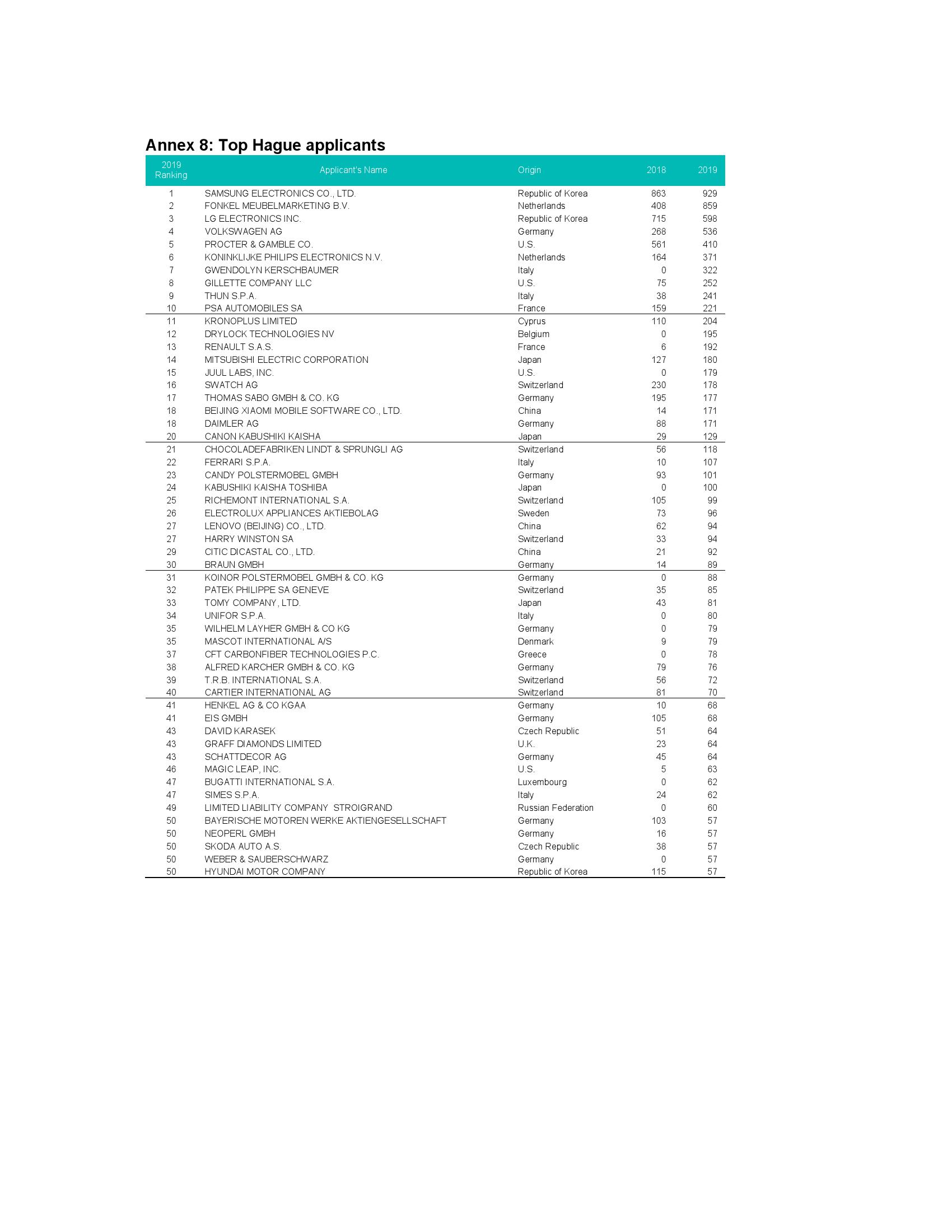在马德里国际商标申请方面,中国以6339件申请继续排在美国和德国之后,保持世界第三。华为以131件申请位列商标申请人第三名,这是中国申请人首次跻身全球前五。此外,虽然中国目前尚不是海牙体系成员,但来自中国用户的申请已达到238件(包含663项设计),增长超过70%,使得中国跻身海牙体系前十大申请人之列。