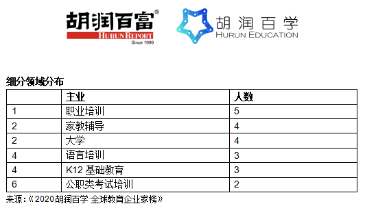 从事职业培训的最多,有5位;其次是家教辅导和开办大学的,各有4位;再次是语言培训和K12中小学基础教育,各有3位;2位从事公职类考试培训。胡润表示:“全球最大的教育企业家主要从事三大领域:一是以好未来和跟谁学为首的帮助小孩进入更好学校的家教辅导机构;二是以中公教育为首的公职类考试培训机构和以新华教育为首的帮你找工作的职业培训机构;三是以新东方为首的帮你走向国际化的语言培训机构。”