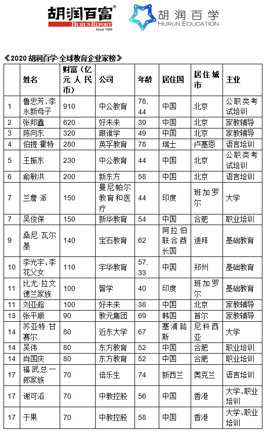 - 全球19位教育领域企业家财富达到十亿美金以上;