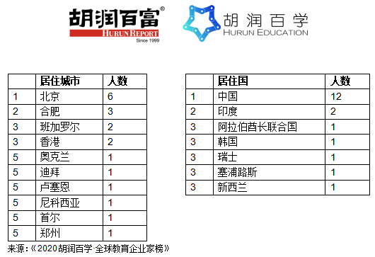 - 北京是世界教育企业家最多的城市,有6位居住在北京;其次是合肥,有3位;再次是香港和班加罗尔,分别有2位;
