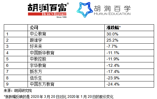 - 中公教育和跟谁学是近两月新冠疫情期间股价上涨最快的教育企业,分别上涨了30%和25%;