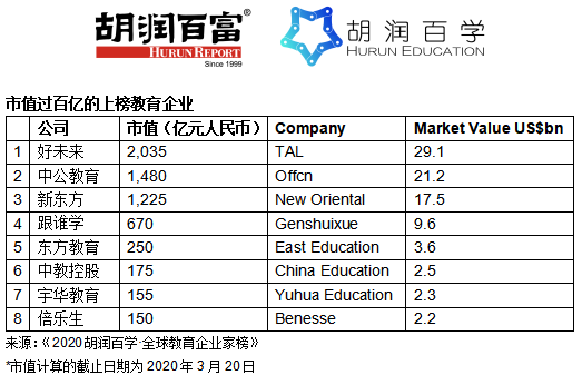 8家上市教育企业市值过百亿,好未来以2,000多亿为首。
