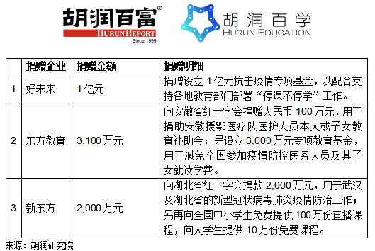 - 3家教育企业在新冠肺炎疫情中合计捐赠1.5亿元,其中好未来捐赠1亿元;