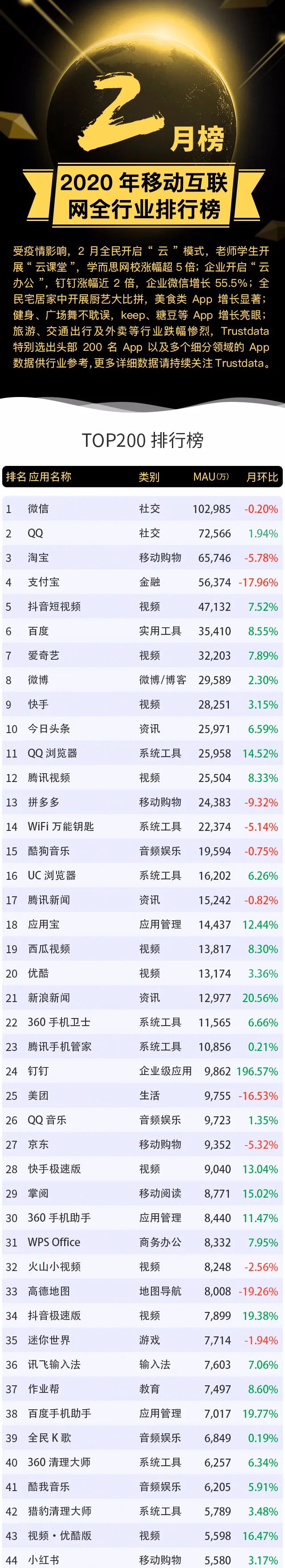 Trustdata:2020年2月移动互联网全行业排行榜 更多阅读:Trustdata:2018年11月移动互联网全行业排行榜Trustdata:2020年4月移动互联网全行业排行榜Trustdata:2020年9月移动互联网全行业排行榜Trustdata:2020年7月移动互联网全行业排行榜Trustdata:2020年10月移动互联网全行业排行榜Trustdata:2020年12月移动互联网全行业排行榜Trustdata:2019年7月移动互联网全行业排行榜Trustdata:2019年1月移动互联网全行业排行榜Trustdata:2018年8月移动互联网全行业排行榜Trustdata:2020年6月移动互联网全行业排行榜Trustdata:2020年3月移动互联网全行业排行榜Trustdata:2020年1月移动互联网全行业排行榜Trustdata:2019年12月移动互联网全行业排行榜Trustdata:2019年11月移动互联网全行业排行榜Trustdata:2019年10月移动互联网全行业排行榜
