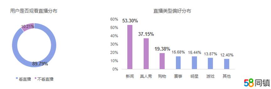 58同镇《疫情影响下的中国下沉市场休闲娱乐洞察报告》还显示,89.79%的用户在疫情期间有观看直播的习惯,新闻、真人秀和购物直播分别占据了直播偏好类型前三甲,占比分别为53.3%、37.15%、19.38%。男性更偏爱游戏、赛事、新闻发布会直播,女性更偏好购物直播。疫情期间,81.24%的用户观看直播的习惯发生了变化,其中, 42.57%的用户观看直播时间比平时更长,34.11%的用户观看的直播类型更丰富。12.25%的用户相比以往更愿意参与给主播点赞和评论等互动,疫情期由于缺乏线下的、面对面的交流,线下用户将社交互动的情愫寄托于线上,提升了线上互动的主动性。