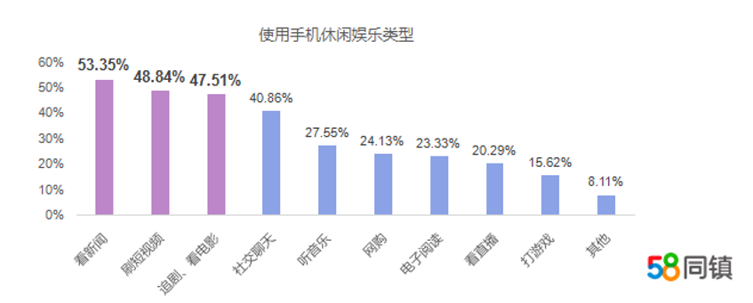 58同镇《疫情影响下的中国下沉市场休闲娱乐洞察报告》还显示出,疫情期间用户平均每天手机娱乐时间长达6.02小时,疫情宅家期间,手机承载了更多休闲娱乐功用。53.35%的下沉市场用户选择用手机看新闻,其次是刷短视频和追剧看电影,分别占比48.84%、47.51%。可见,疫情牵动着全国人民的心,即便是休闲娱乐时,也不忘关注国际国内疫情动态,了解最新抗疫资讯。
