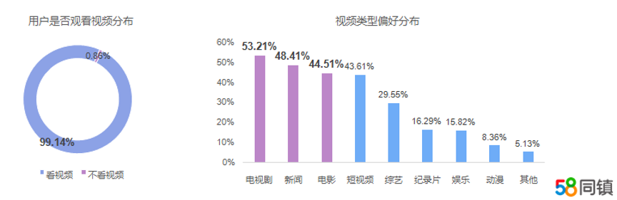 在疫情防控期间,观看视频是很多人必备的“宅家”休闲选择。据58同镇《疫情影响下的中国下沉市场休闲娱乐洞察报告》统计,99.14%的下沉市场用户在疫情期间都有观看视频的习惯。在观看视频的类型方面,偏爱电视剧的占比53.21%,其次是新闻和电影,分别占比48.41%和44.51%。