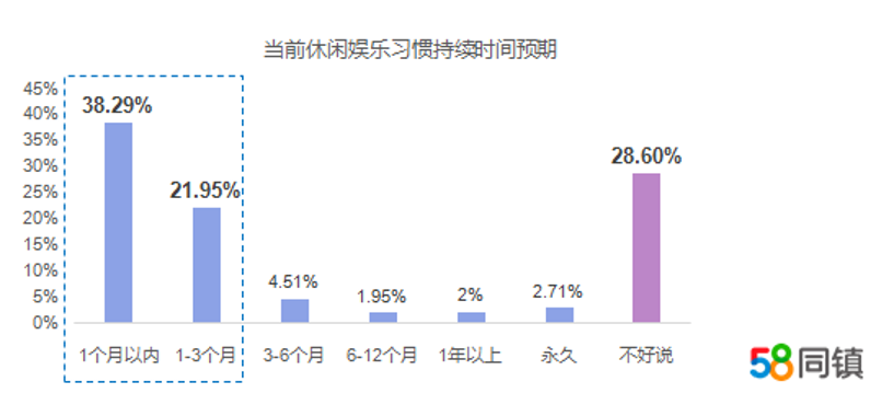 展望疫情过后的下沉市场,58同镇《疫情影响下的中国下沉市场休闲娱乐洞察报告》显示,60.24%的用户认为休闲娱乐习惯在3个月内可以恢复至平时状态。疫情结束后,用户最想做的事情是工作赚钱,占比达到48.43%,其次是陪伴家人、旅游、体育锻炼和下馆子等。疫情期间被压抑的消费需求会在疫情结束后逐渐释放,外出就餐、本地游、健身、购房买车等或将快速回暖并获得较大发展空间,乡镇用户可通过58同镇满足各种生活服务消费场景需求。