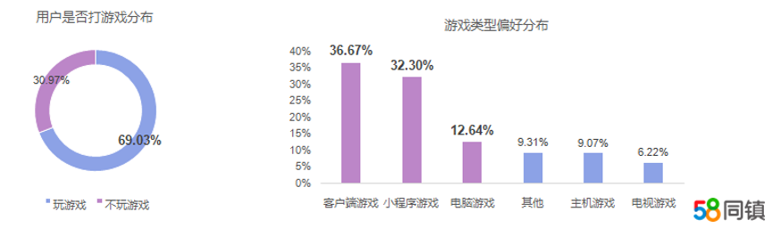 与以往相比,游戏用户在疫情期间的积极性普遍提高。58同镇《疫情影响下的中国下沉市场休闲娱乐洞察报告》显示,69.03%的下沉市场用户疫情期间的休闲娱乐时光会选择打游戏,其中,手机客户端游戏占比36.67%排名第一、小程序游戏占比32.3%排名第二。与以往相比,66.03%的用户疫情期间游戏娱乐的习惯发生了变化,主要表现在23.8%的用户打游戏时间更长,21.38%的用户尝试玩的游戏数量更多,也有19.81%的用户之前不喜欢打游戏,疫情期间加入游戏列队。