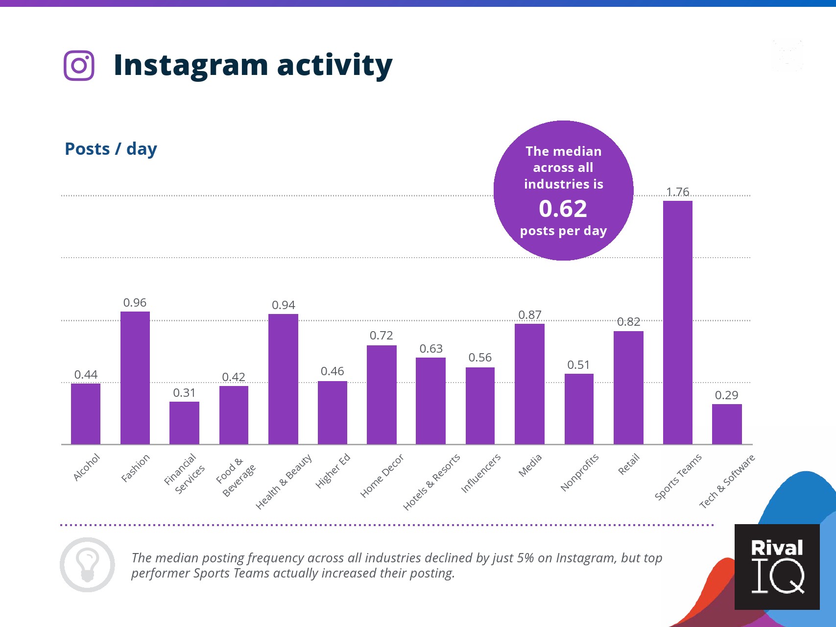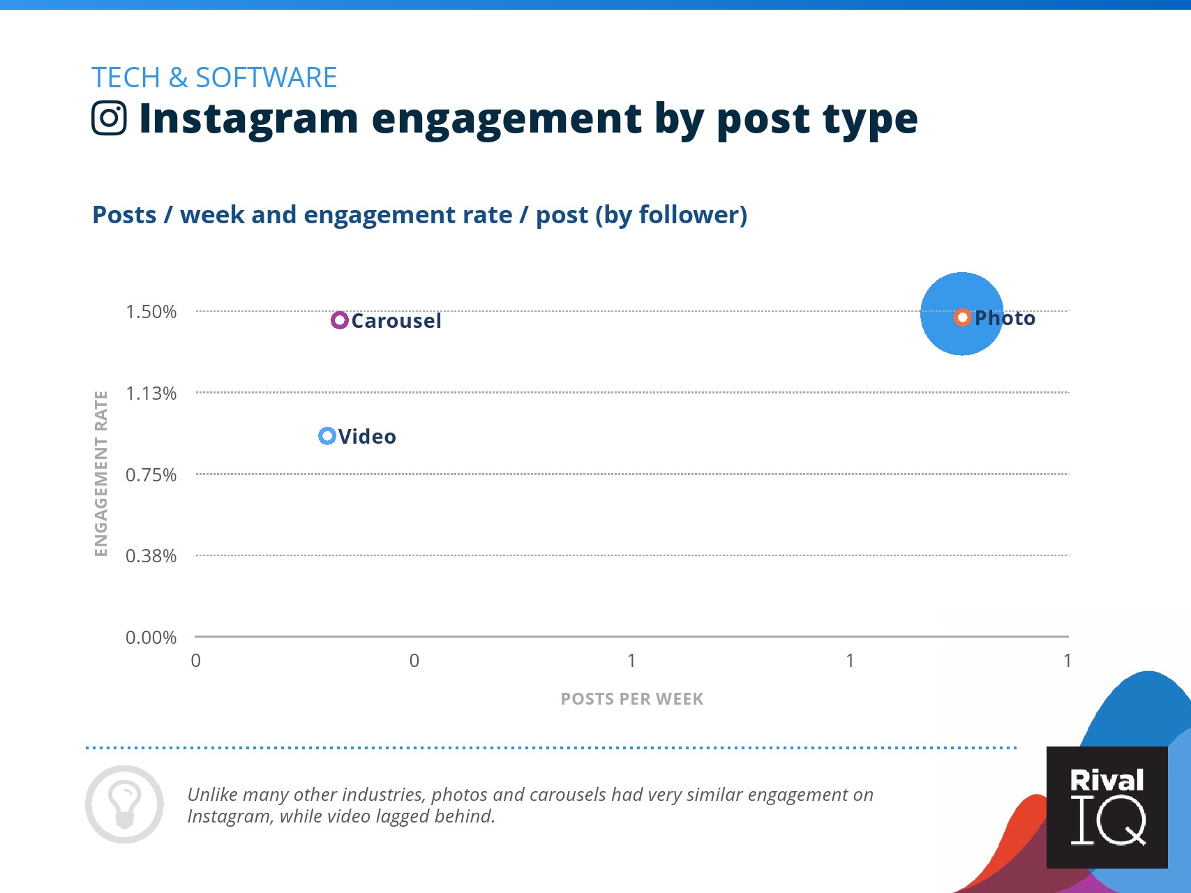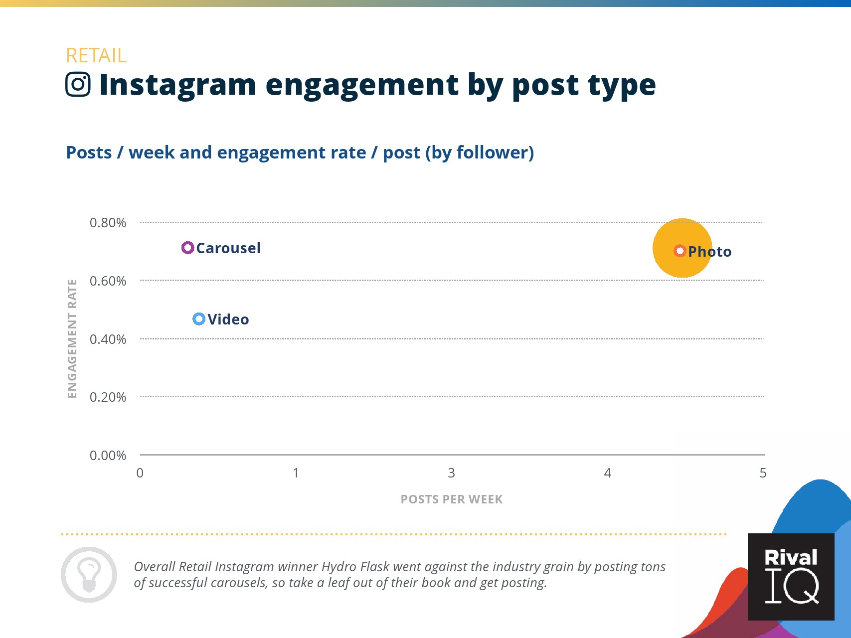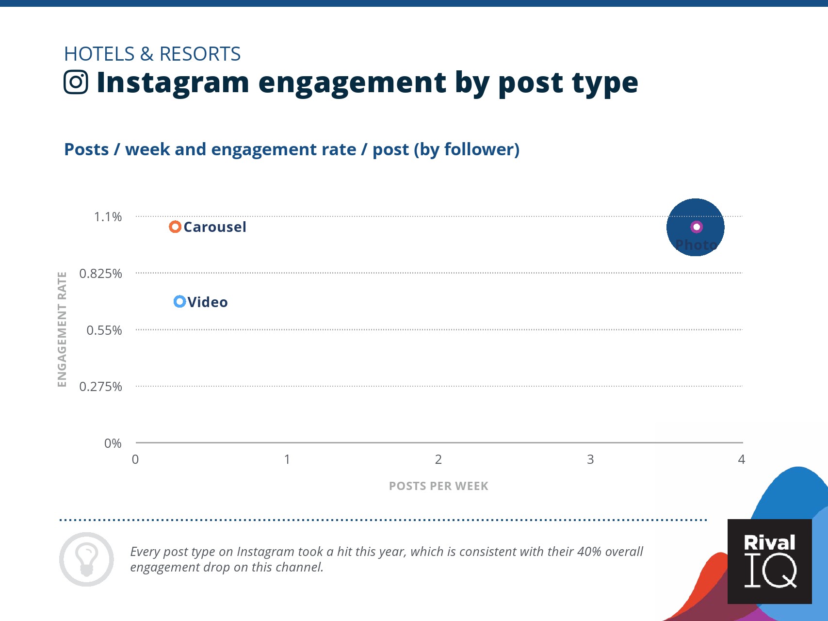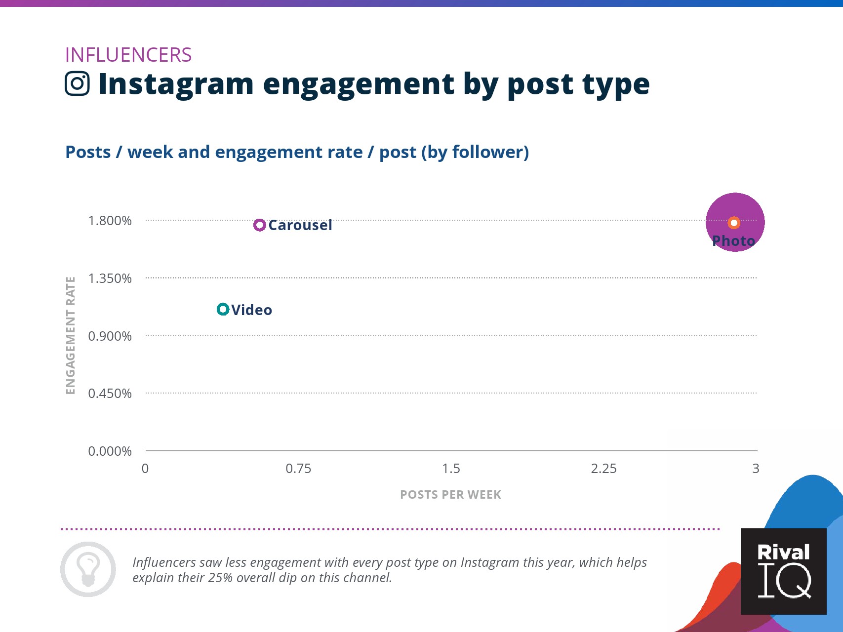 总体而言,Instagram上品牌的参与率有所下降。根据RivalIQ,今年每个行业都在Instagram上受到冲击,全行业平均参与率从1.60%降至1.22%,降幅为23%。