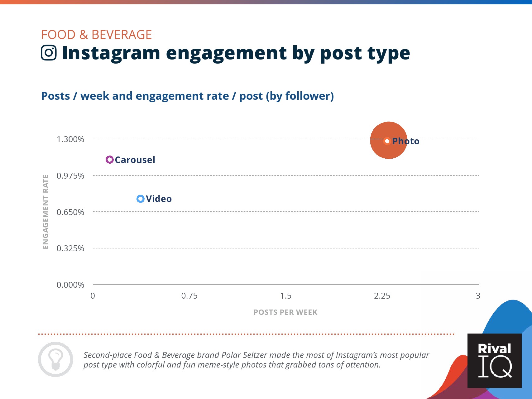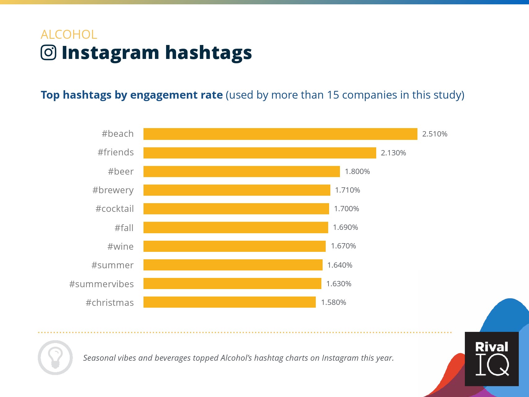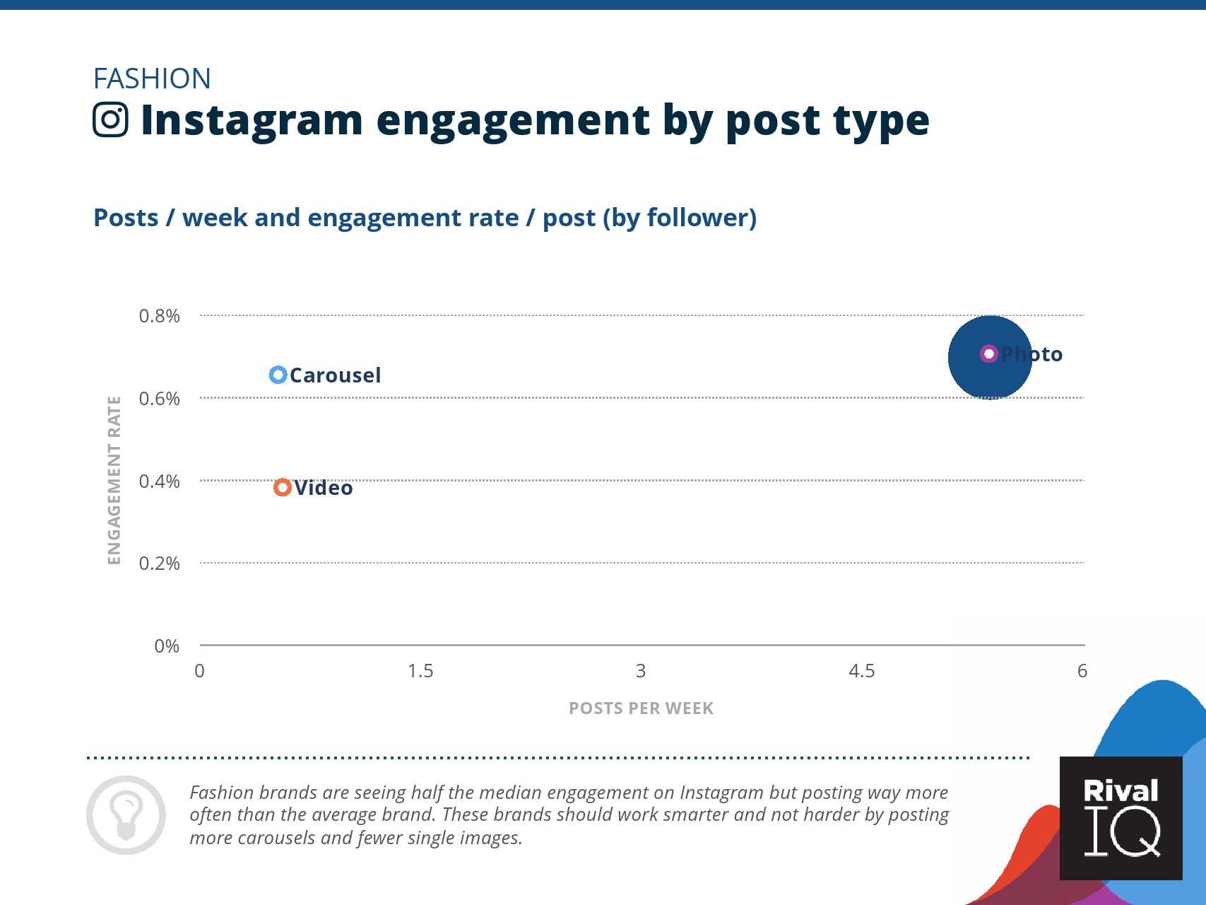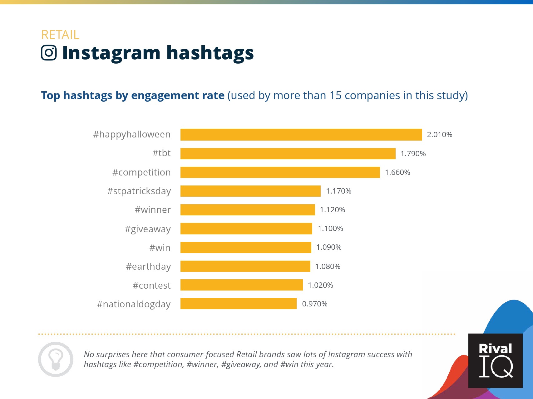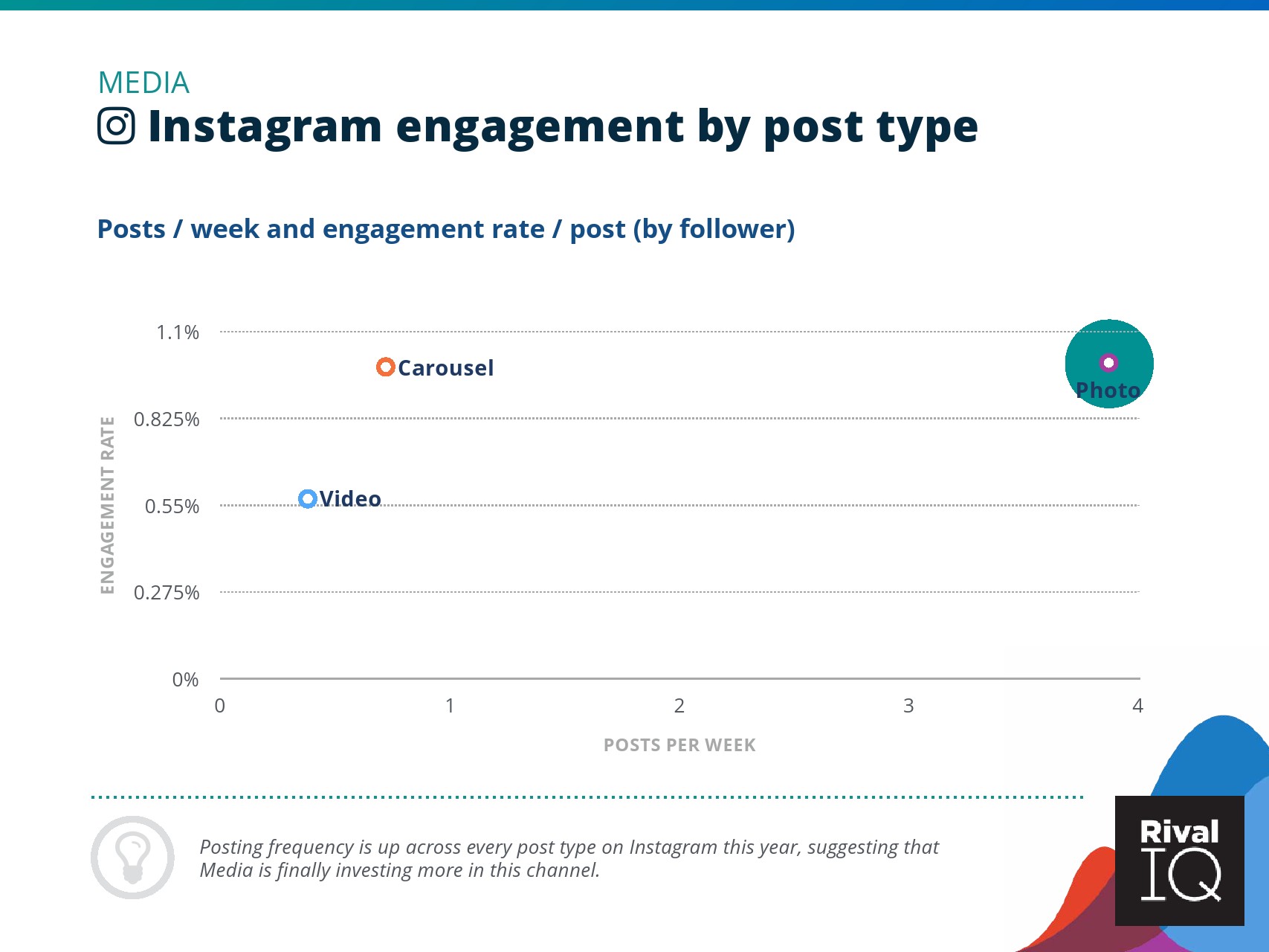 总体而言,Instagram上品牌的参与率有所下降。根据RivalIQ,今年每个行业都在Instagram上受到冲击,全行业平均参与率从1.60%降至1.22%,降幅为23%。