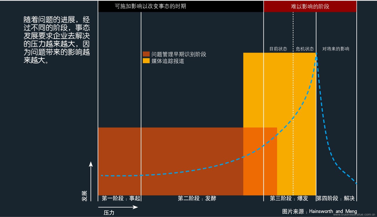 这个阶段,问题越来越清晰。先是专业媒体以及行业专家、专业人士的介入。这是问题突起的阶段,事态再逐步扩大,要求企业处理问题的压力越来越大。但是,如果此时组织进行干预的话,还是可以影响到事态的进一步扩展。这时比较难于掌握的同样是紧迫性的定性,也许企业领导人的注意力放在自认为更大更紧迫的问题上了,而当下的问题却没有得到充分的重视。