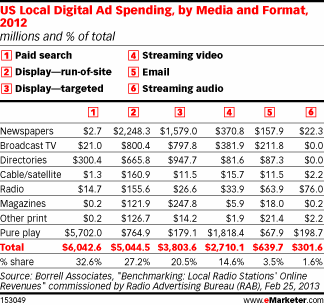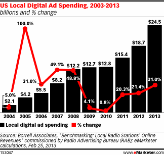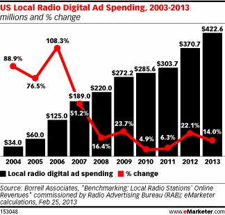 根据Borrell Associates 于今年二月份对业内超过6200家地方网络电台的调查,2012年美国区域网络电台广告业务额激增22%,超过3.7亿美元。这一速度是2011年的三倍,也略高于同年整体地方数字广告业务21.4%的增速。