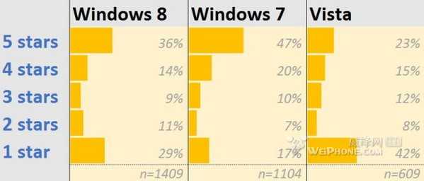 在上面的图中,五星的意思相当于非常棒,而一星大约就是说糟透了。我们可以看到 Windows 8 虽然整体评价上不如当前主流的 Win 7,但相比史上最悲剧的 Windows Vista 还是要好上不少。
