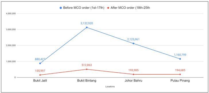 来自Moving Walls的统计数据显示,除了Johor Bahru和Penang等州外,Bukit Jalil、Bukit Bintang等地区的消费者人数急剧下降。降幅最大的是首都主要购物区Bukit Bintang。在MCO之前,该市约有3132920名消费者。在MCO之后,这一数字下降到512863人。