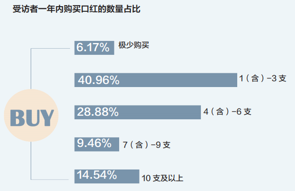 “斩男色”、“烂番茄色”、“吃土色”,口红色号繁多,95后“美妆精”们在口红上囤货也是毫不手软。调研数据显示,38.34%的受访者一年内购买的口红数量为4-9支,还有14.54%的受访者一年购买10支及以上,两者比例合计已超过半数。受访者表示,“用完再买”并不适用于口红这类单品,大多数会购买不同的口红来搭配不同的妆容。