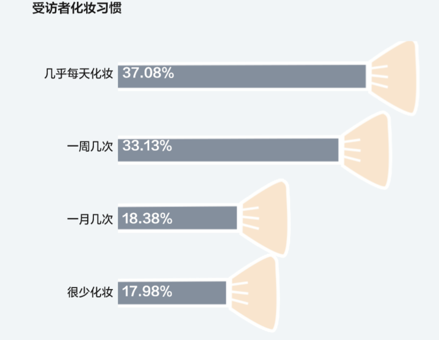 而最常见的化妆场合则是“出门逛街约会”,其次是“朋友聚会”。不过,作为新新人类,95后化妆并不是为了让别人欣赏,而更多是为了取悦自己。25%的受访者表示,“开心就化”、“想化就化”,化不化妆完全看心情,这也可以从近5%的受访者待在家里有时候也会化妆的数据结果体现出来。