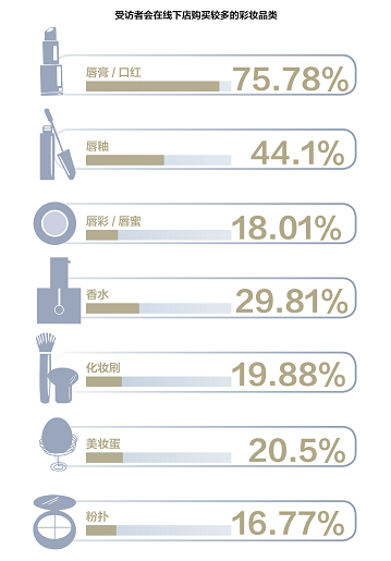 所以,门店这样的独特优势使得34%的受访者坚持底妆类产品一定要在线下试过后才会买;有近20%的受访者甚至表示,粉底液(膏)类的产品他们一定会选择在线下门店购买,而妆前乳、气垫、散粉类产品也会考虑在门店购买。