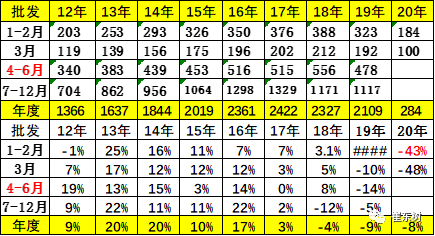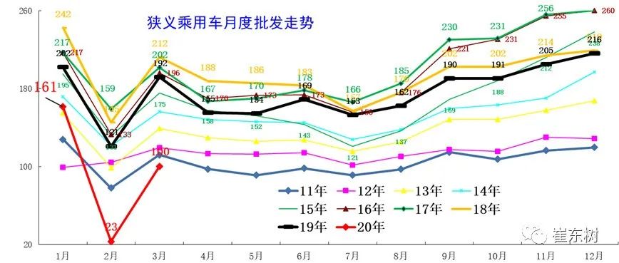 3月厂家批发销量100.0万辆,同比去年3月下降48.1%,环比2月增长3倍。2019年车市的批走势出现前高后低趋势,对2020年年初压力很大,但国六实施后的库存增量对批发回稳有促进作用。