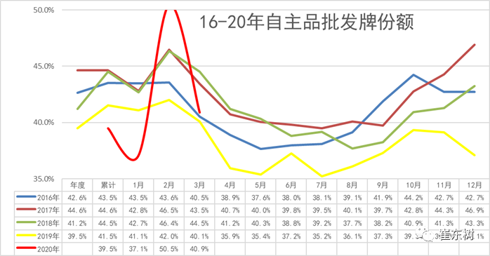 自18年5月以来,连续20个月的自主品牌份额都同比下降较大。19年的全年份额下降速度仍然较大。20年的疫情下的自主品牌份额回升。