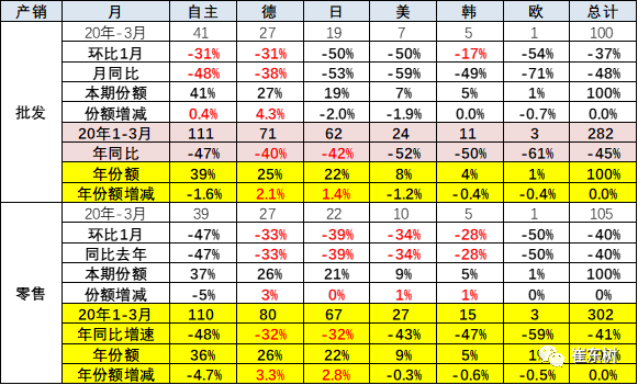 3月零售仍同比下降40%,其中德系轿车同比去年3月降33%,自主轿车同比降47%。合资各车系表现相近。