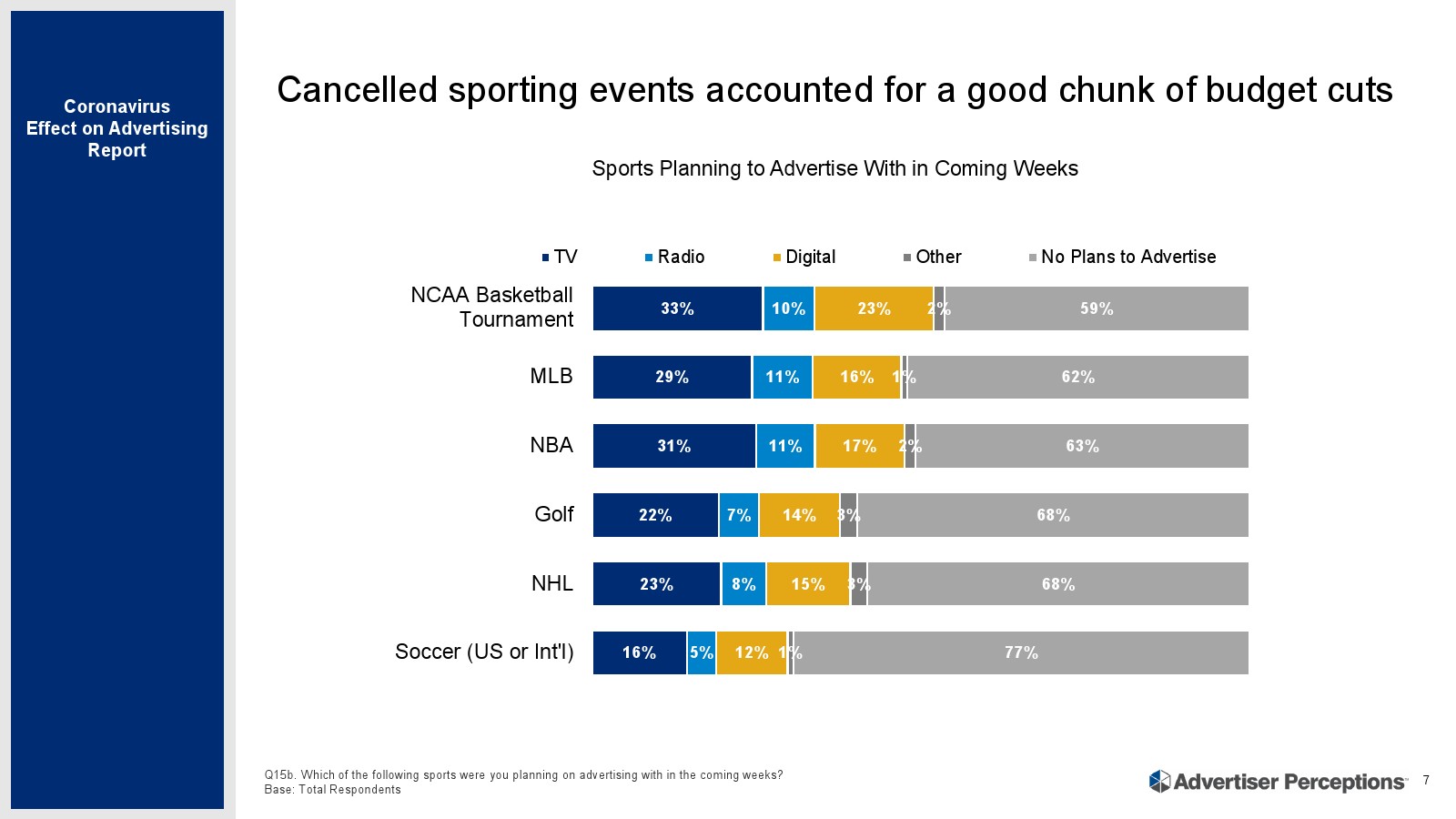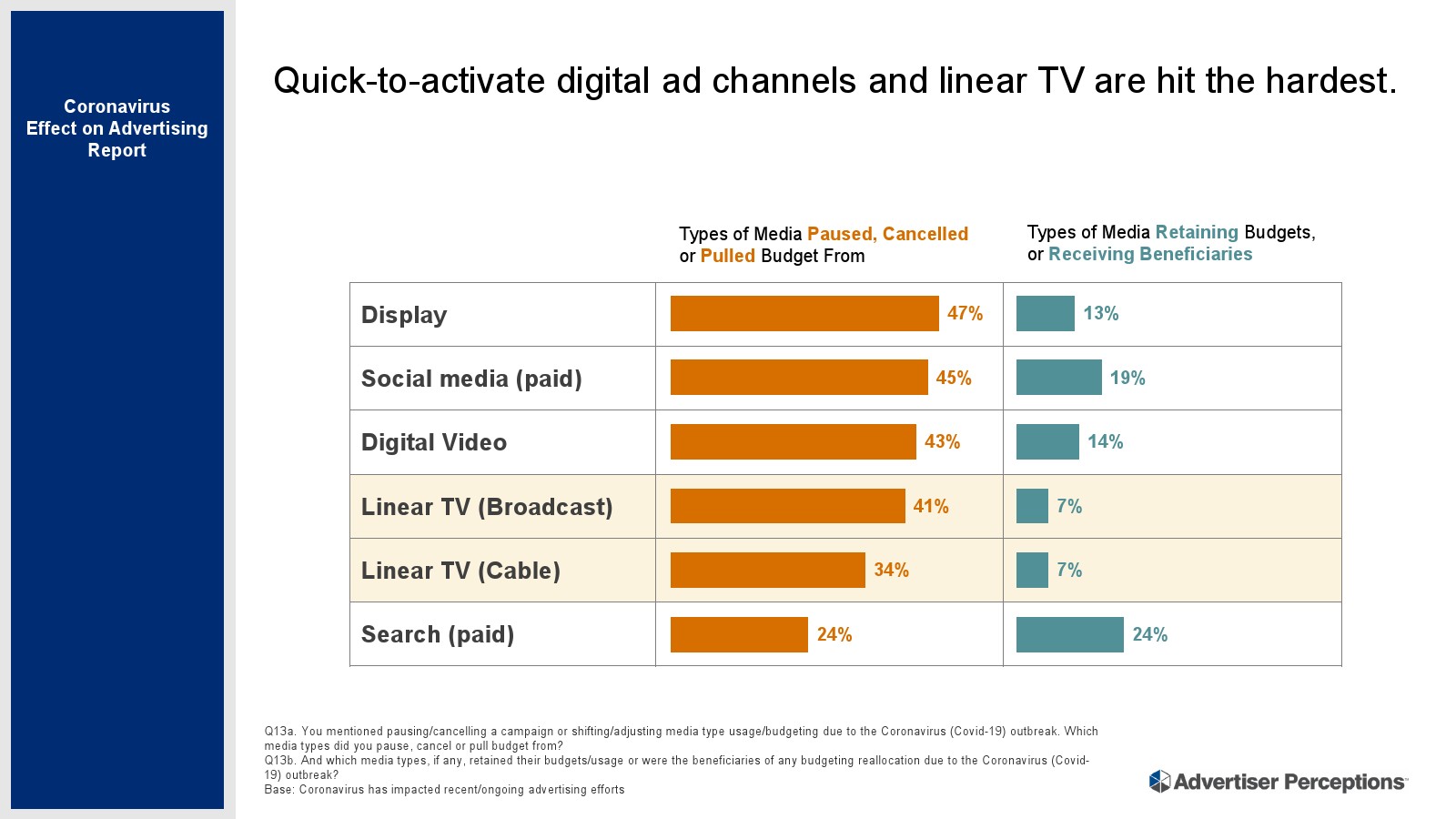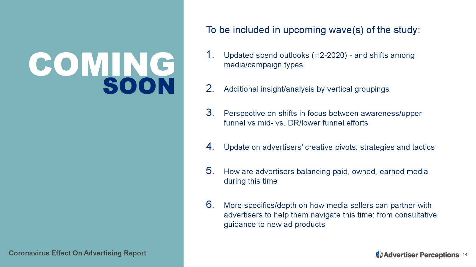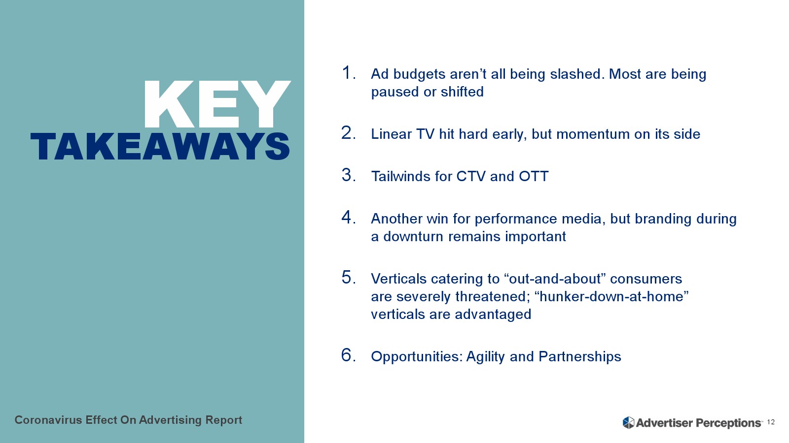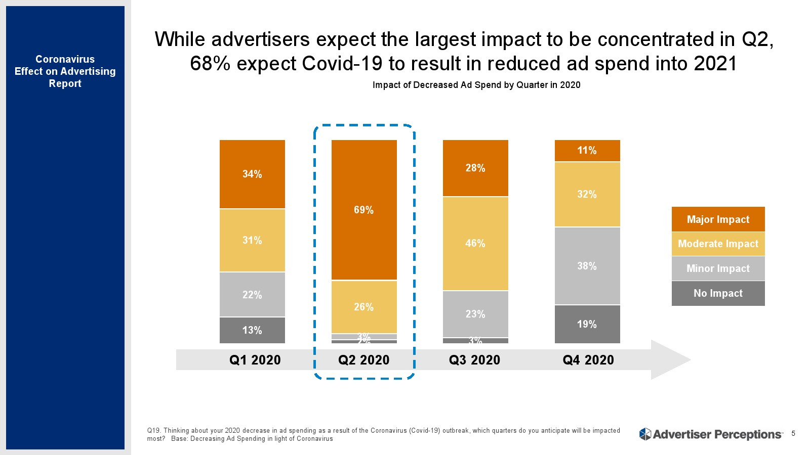 - 广告商预计2020年第二季度将感受到最严重的影响,但这可能会持续几个季度,因为2/3的广告商还预计冠状病毒将导致2021年广告支出减少。