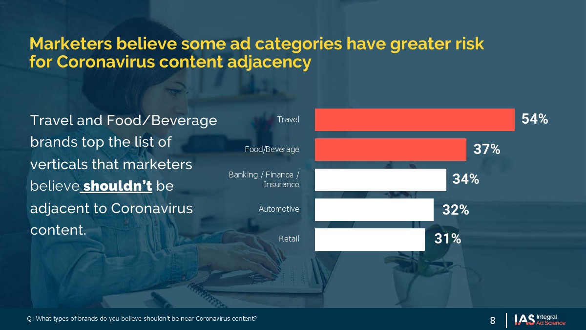 旅行、食物/饮料和金融被认为是最不适合出现在冠状病毒内容附近的行业。