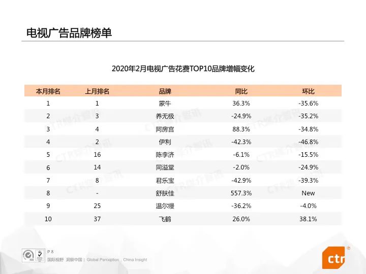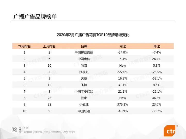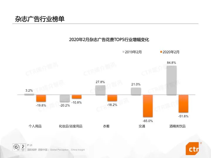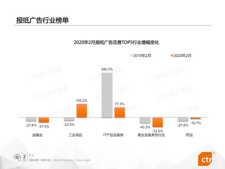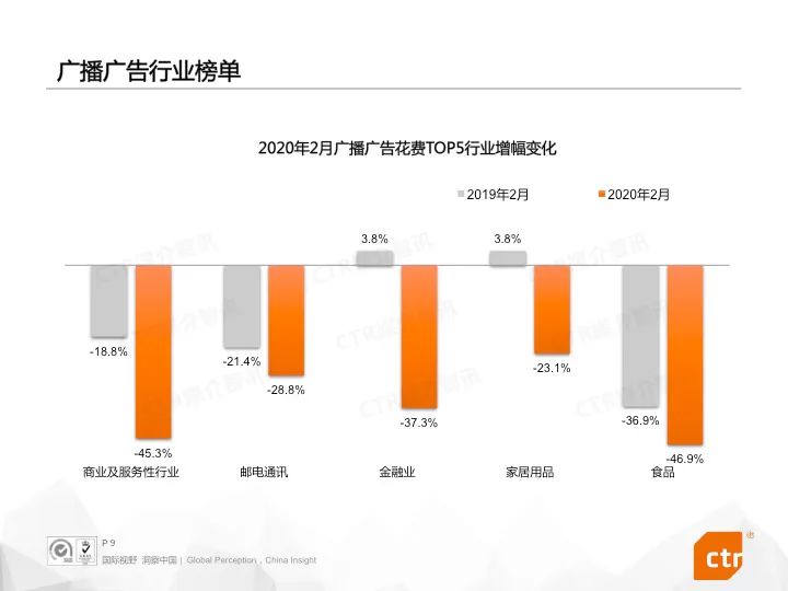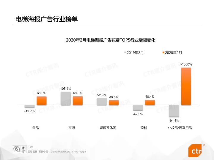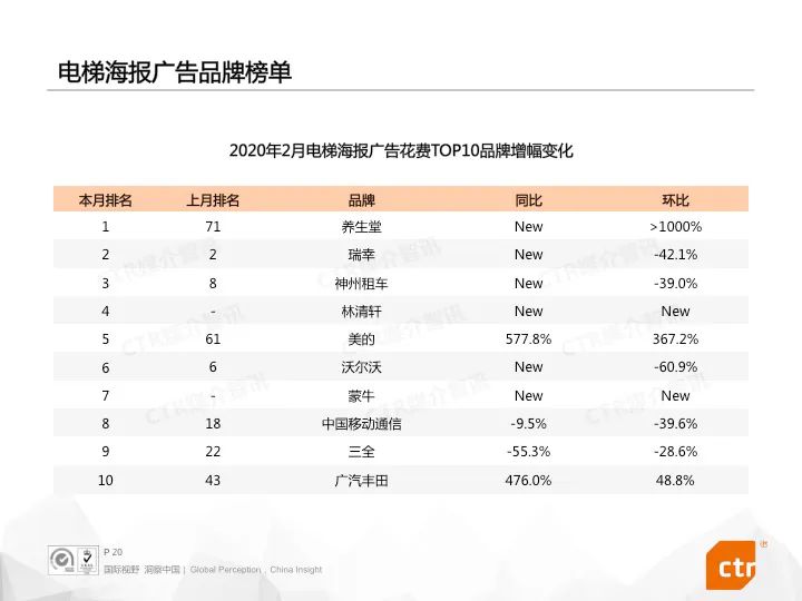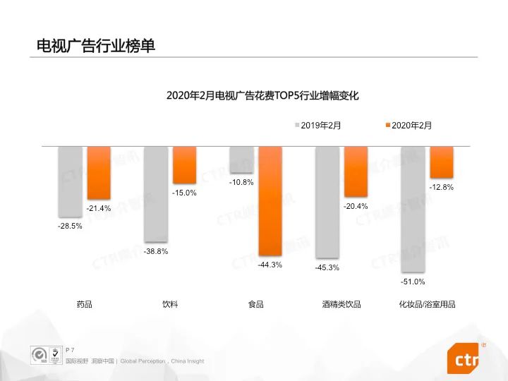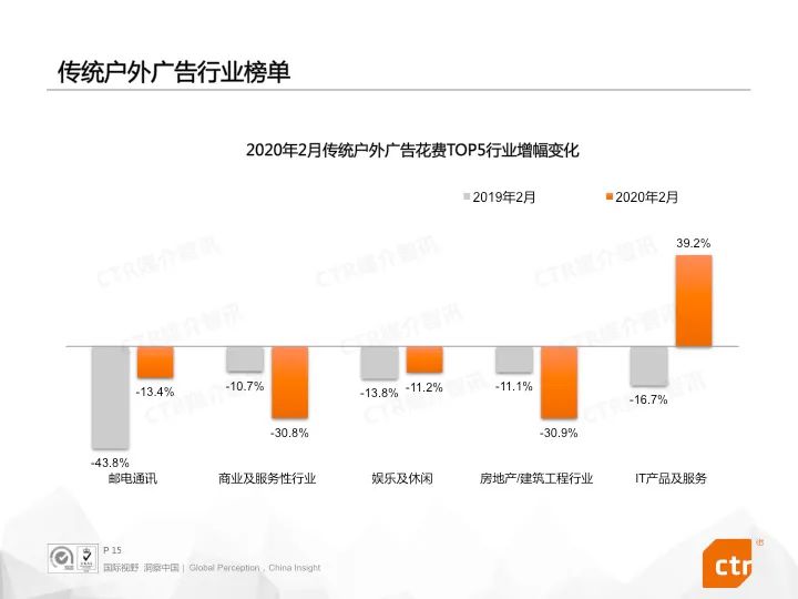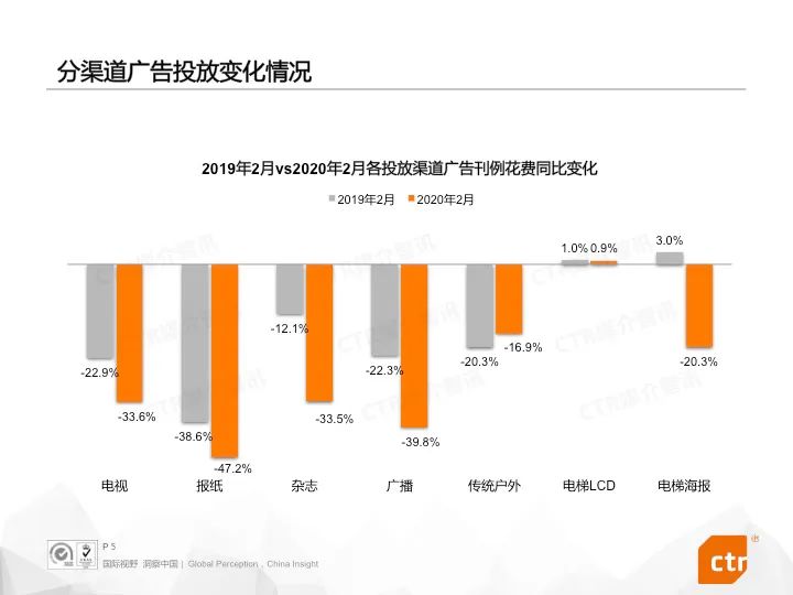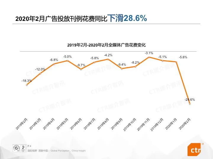 2020年2月,受到疫情影响,广告市场整体投放出现明显下滑。根据CTR媒介智讯的数据显示,广告主的避险需求加之各广告投放渠道资源量的下滑造成广告市场在2月份的刊例花费同比减少28.6%。此外,由于全国影院在疫情期间处于关闭状态,影院视频广告在2月份的投放为零。