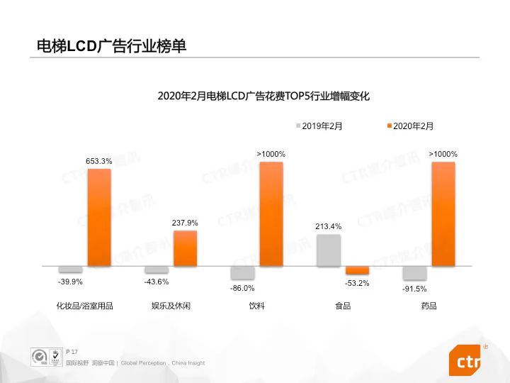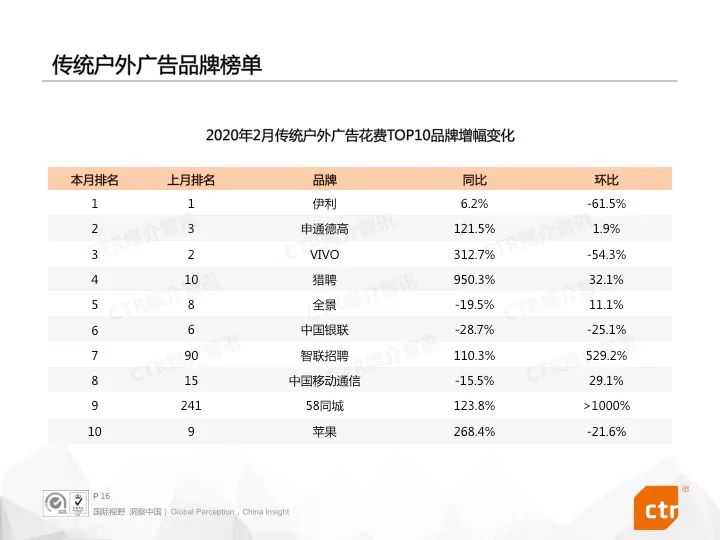 互联网在线服务的品牌也在2月份增加了广告投放,例如在线教育网站猿辅导,其在电梯LCD首次投放广告。求职招聘类服务网站猎聘网、智联招聘、BOSS直聘在传统户外广告花费分别增长950.3%、110.3%、123.0%。