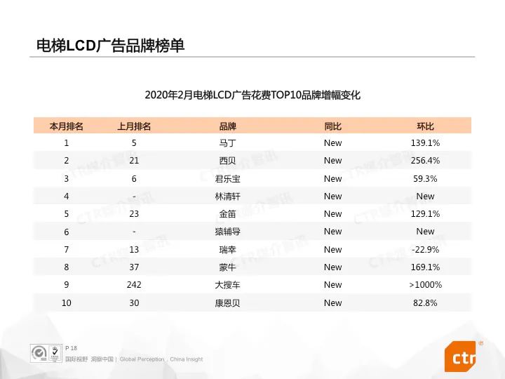 此外,化妆品及浴室用品行业内的部分品牌在2月份也有增投迹象,特别是一些洗浴用品和个人护肤用品。化妆品/浴室用品行业整体在电梯LCD广告投放同比上涨653.5%,在电梯海报广告投放同比上涨超十倍。从品类看,护肤用品在两个渠道的广告花费同比上涨超十倍,化妆品/浴室系列用品的广告花费同比增长125.1%。增长主要源于男士香氛护理品牌马丁、草本护肤品牌林清轩的新增投放。一些知名洗护品牌沙宣、舒肤佳等在部分渠道的广告花费也有明显增长。舒肤佳在电视广告的刊例花费同比上涨557.3%,旗下多款产品如舒肤佳沐浴露、纯白清香香皂、樱花&白茶香泡沫抑菌洗手液等均有不同程度的花费增长。