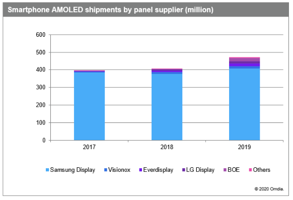 在面板供应商方面,三星显示在2019年出货4.07亿片智能手机AMOLED面板,比2018年增长了8%。这使该公司在市场上处于主导地位,全年单位出货量占全球86%。