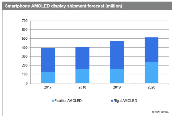 这种增长完全由柔性AMOLED的需求驱动,预计2020年柔性AMOLED出货量将增长50%。对可折叠智能手机的需求正推动柔性AMOLED销售的增长。