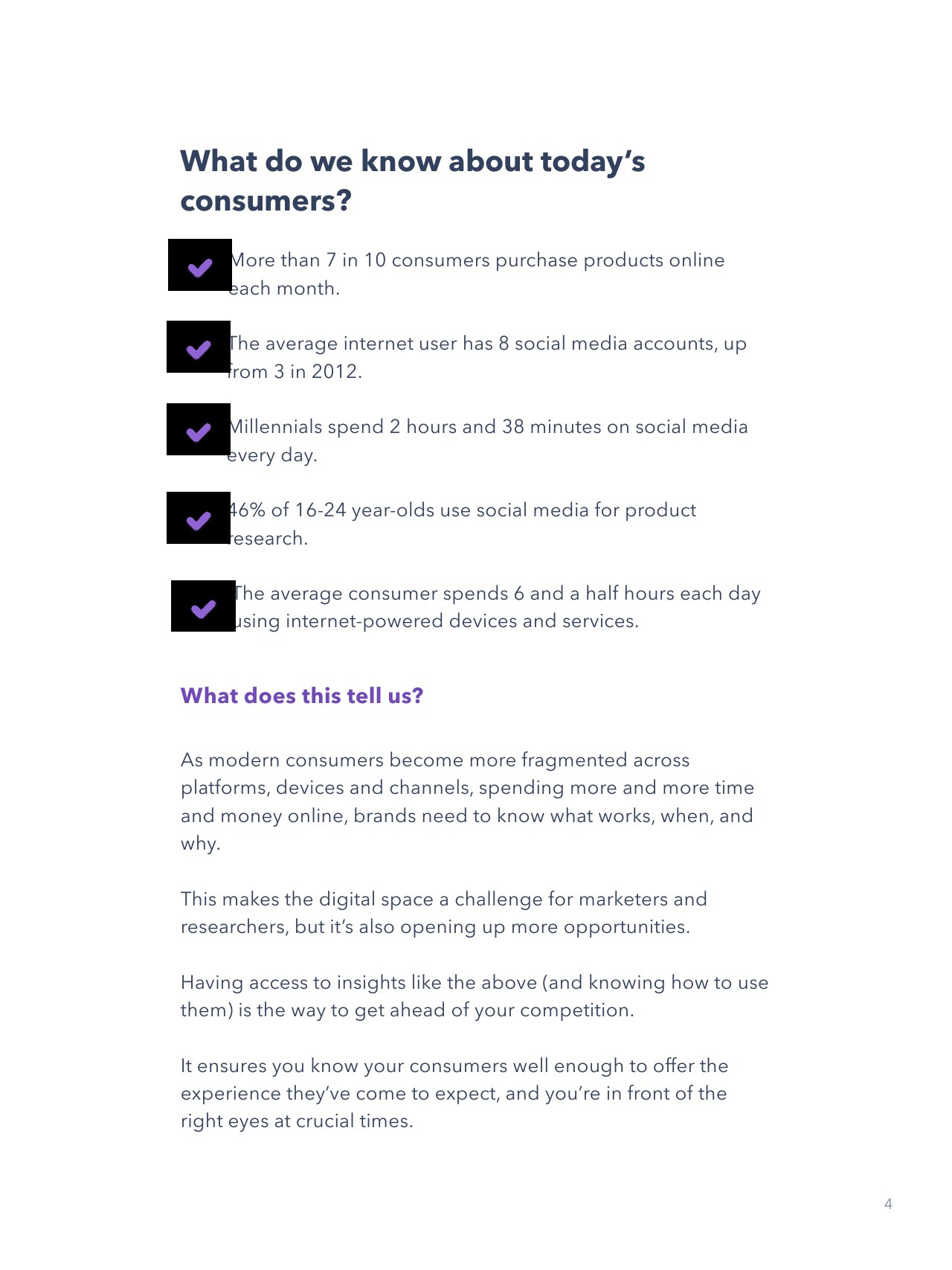 这使得数字空间对营销人员和研究人员来说变成了一个挑战,但它也打开了更多的机会。拥有上述洞察力并知道如何使用它们是在竞争中脱颖而出的唯一方法。只有你足够了解你的消费者,为他们提供他们期望的体验,并在关键时刻拥提供正确的信息,才能在竞争中脱颖而出。