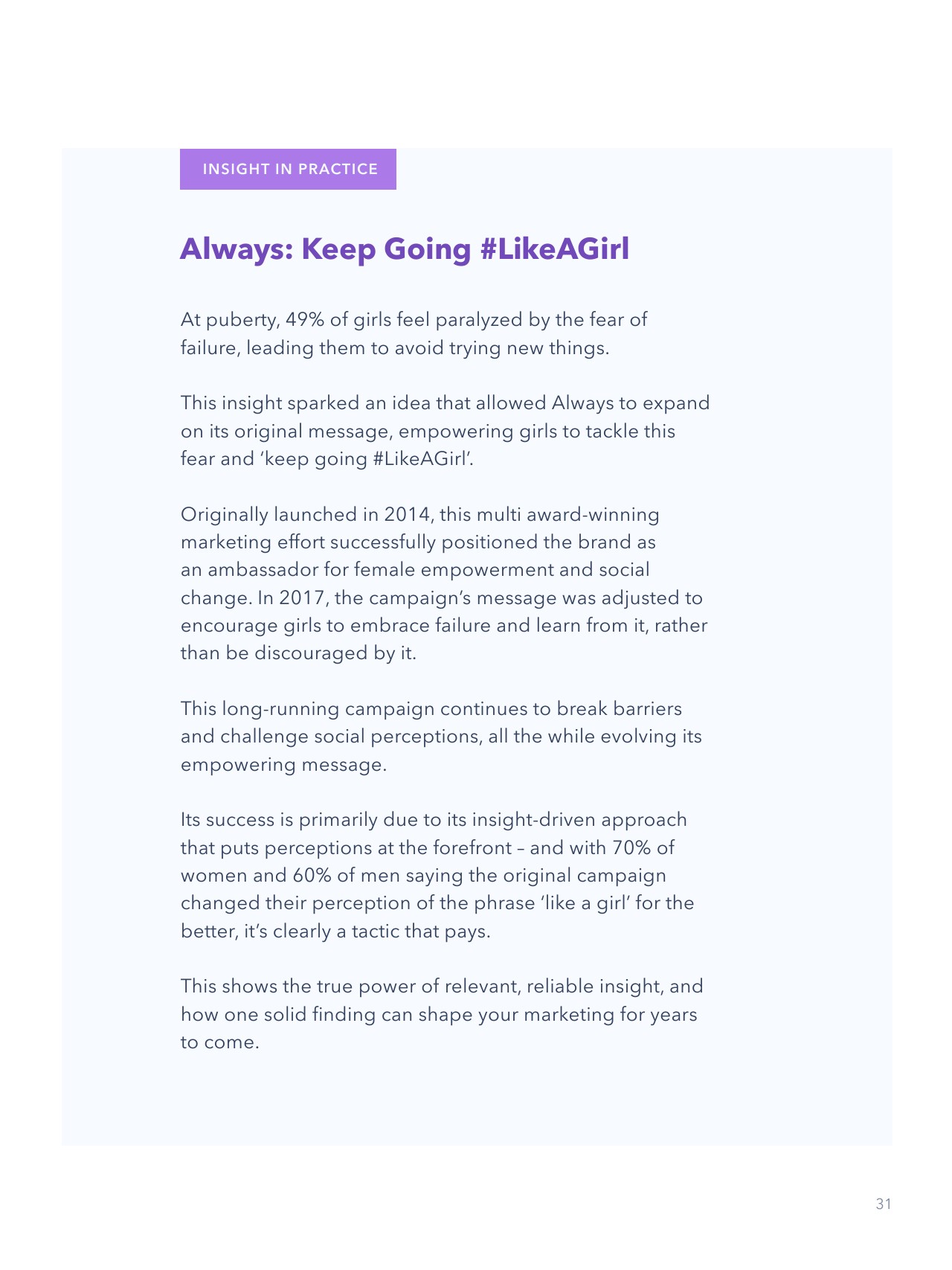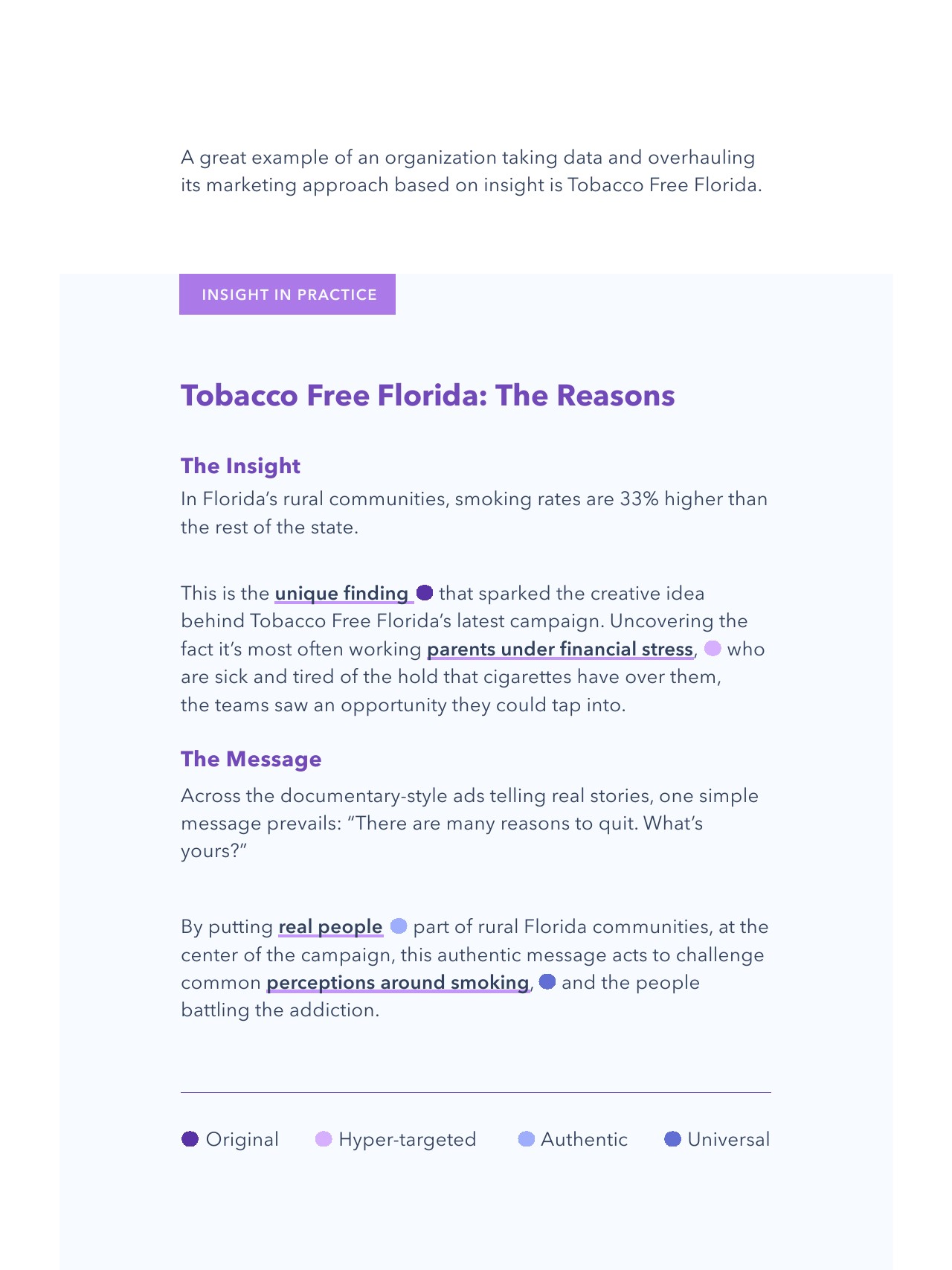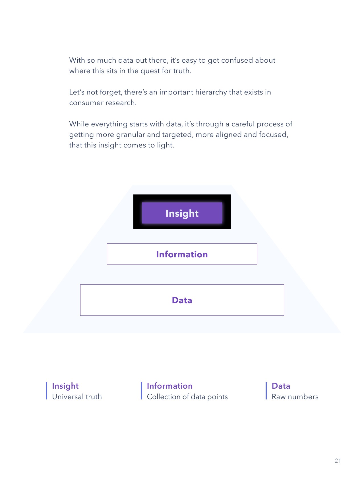 现在的品牌可以访问无穷无尽的数据,但数据丰富并不意味着你有洞察力。洞察力是关于客户的普遍的、人类的真理。它揭示了关于客户的独特的看法和行为,你可以从中了解客户的真实面目。