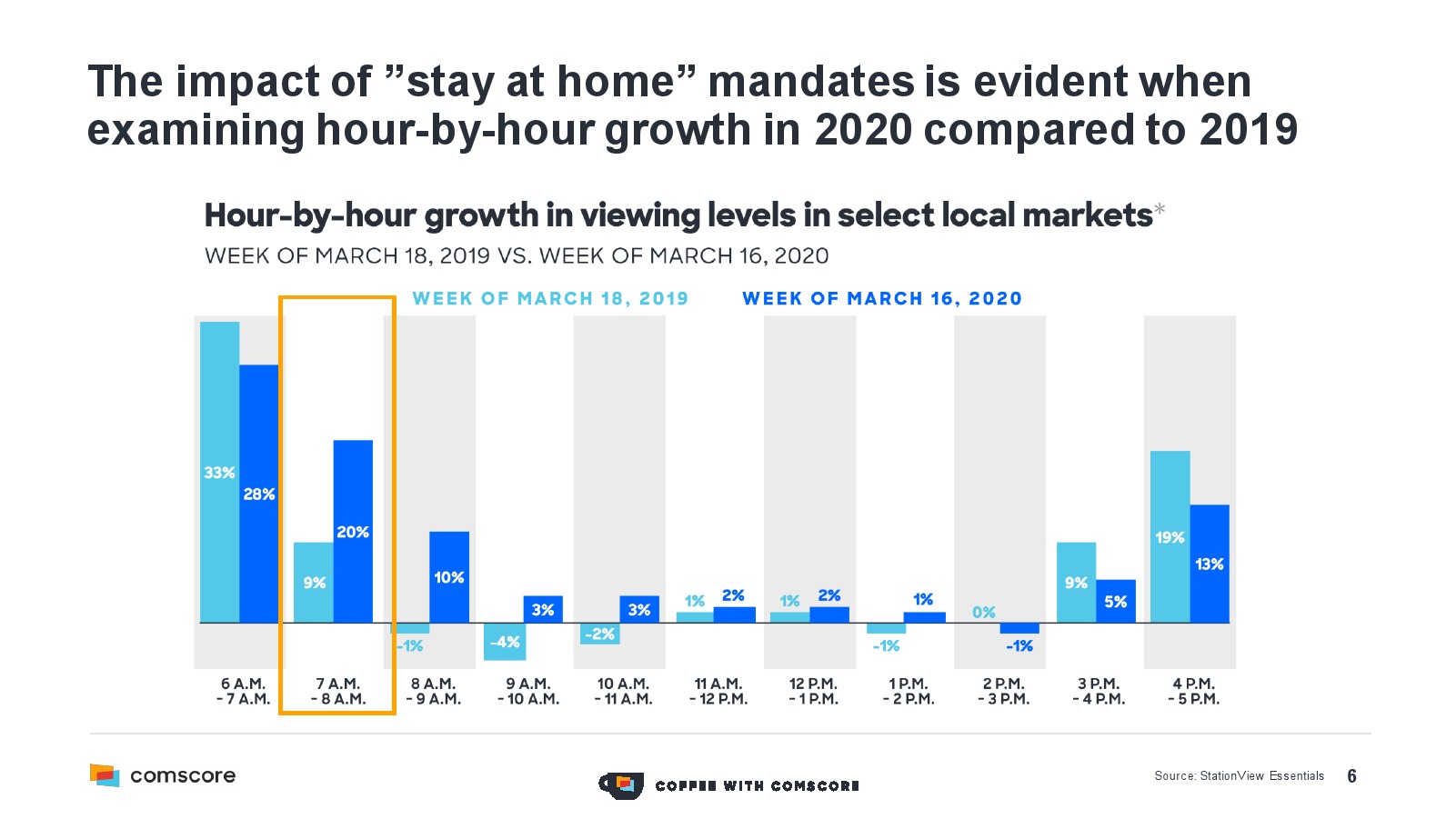 当考察2020年与2019年电视观看时间,“待在家里”的要求的影响是显而易见的。