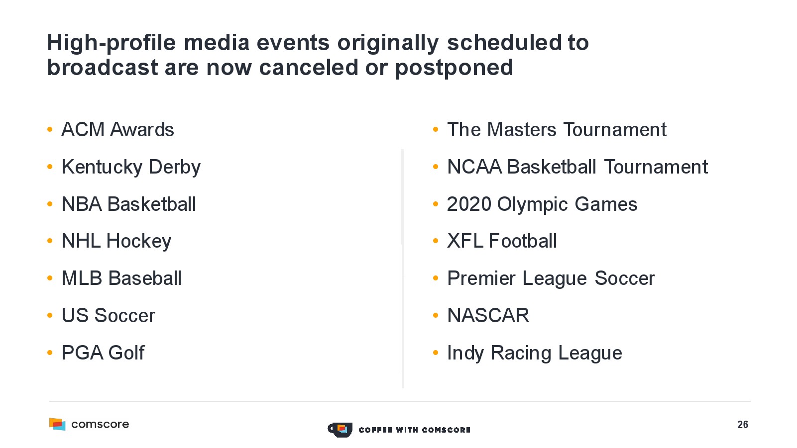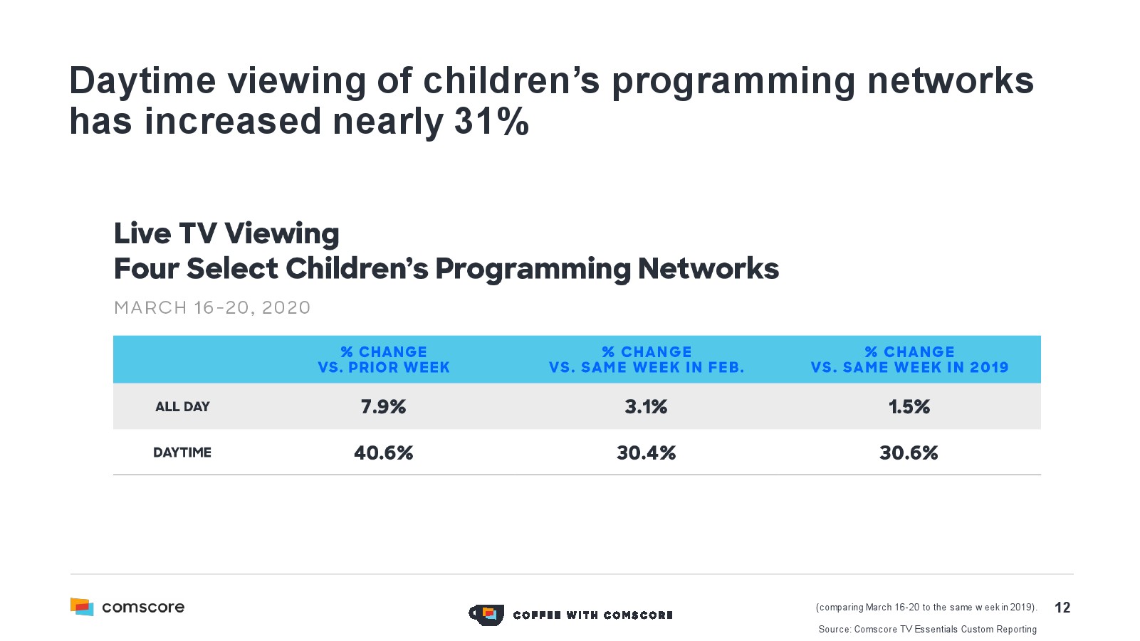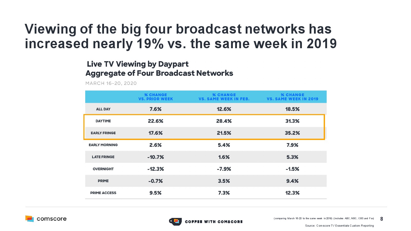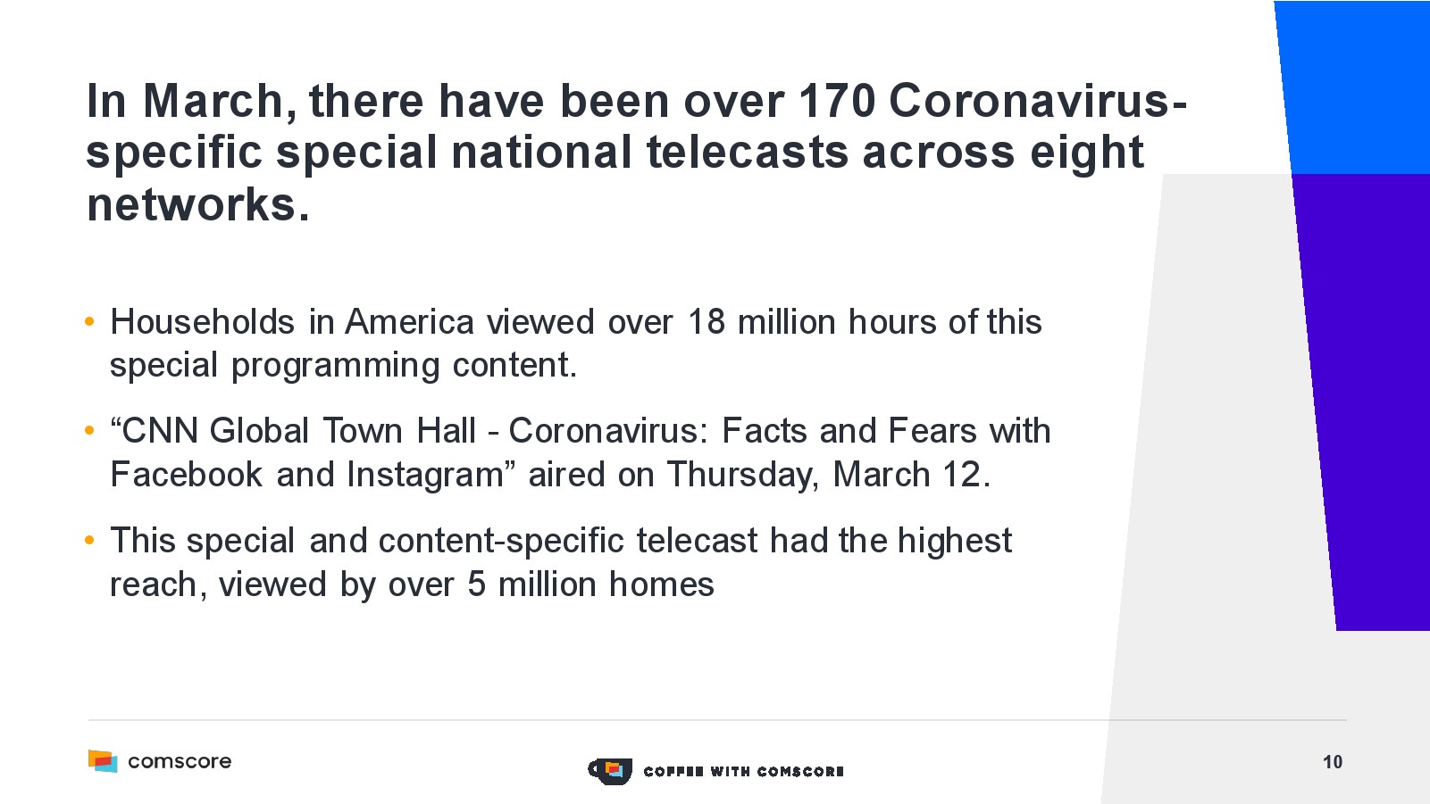 3月份,8个网络上有170多次关于新冠状病毒的特殊国家电视转播。美国家庭观看了超过1800万小时的特别节目内容。