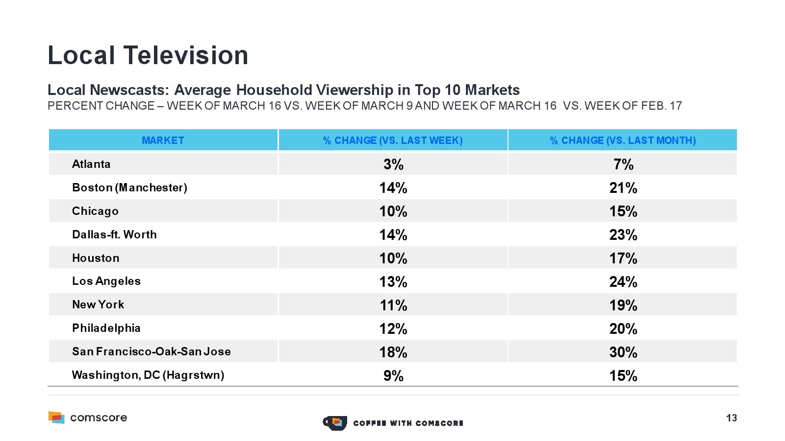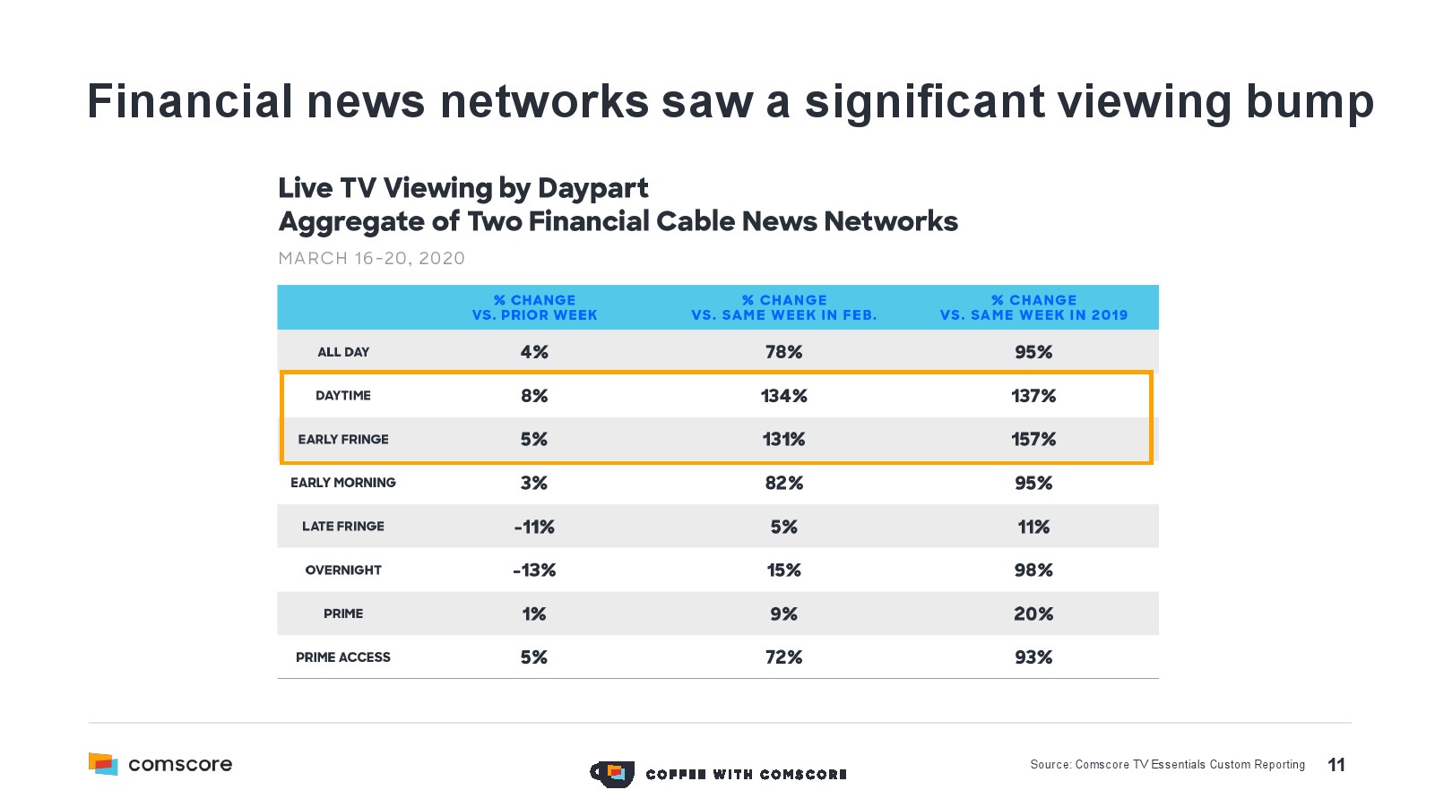 2020年3月16-22日与去年同一周比,四大广播网的收视率增长了近19%,有线新闻网络的收视率增长了73%。