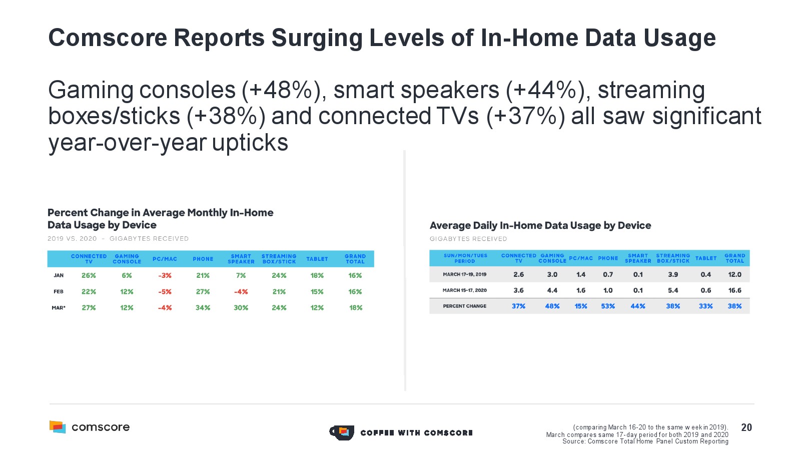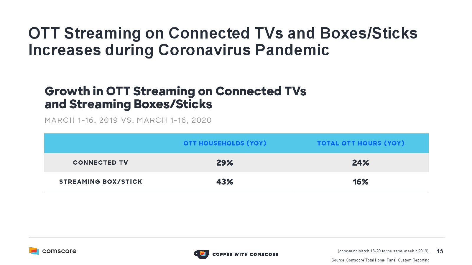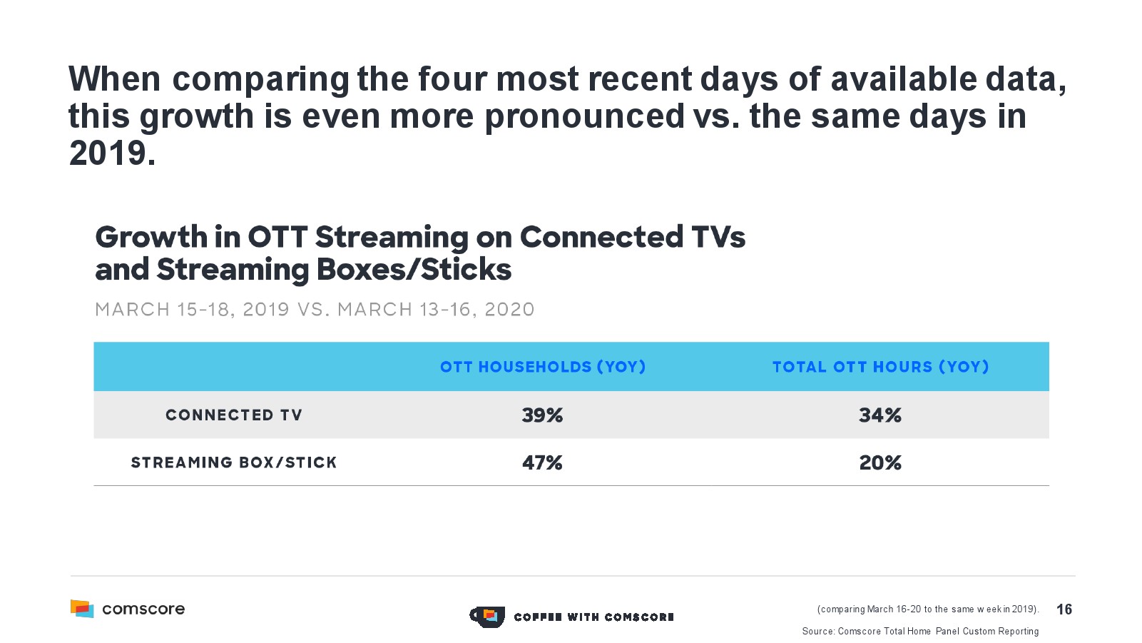 在冠状病毒大流行期间,联网电视和流媒体盒/棒的收视率也在增加。最近四天的可用数据与2019年同期相比,这种增长更加明显。