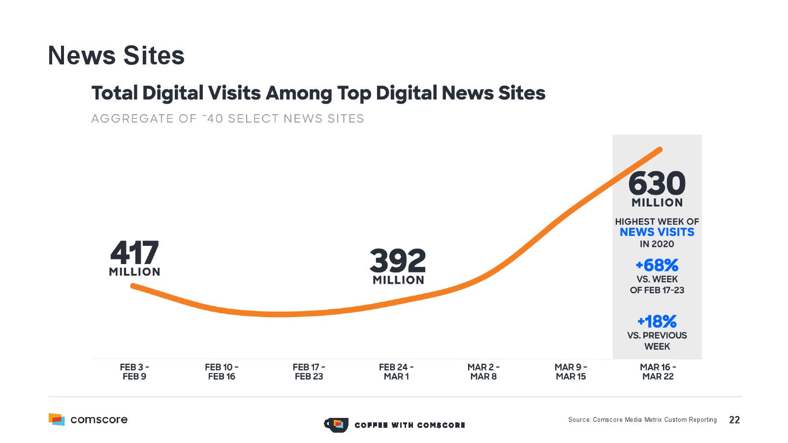 2020年3月16-22日,新闻网站周访客数量达6.3亿人,比2月17-23日访客数量提高68%,比前一周访客数量提高18%。