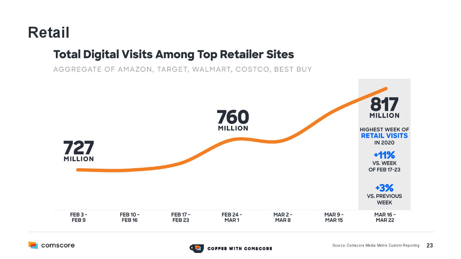 2020年3月16-22日,零售网站周访客数量达8.17亿人,比2月17-23日访客数量提高11%,比前一周访客数量提高3%。
