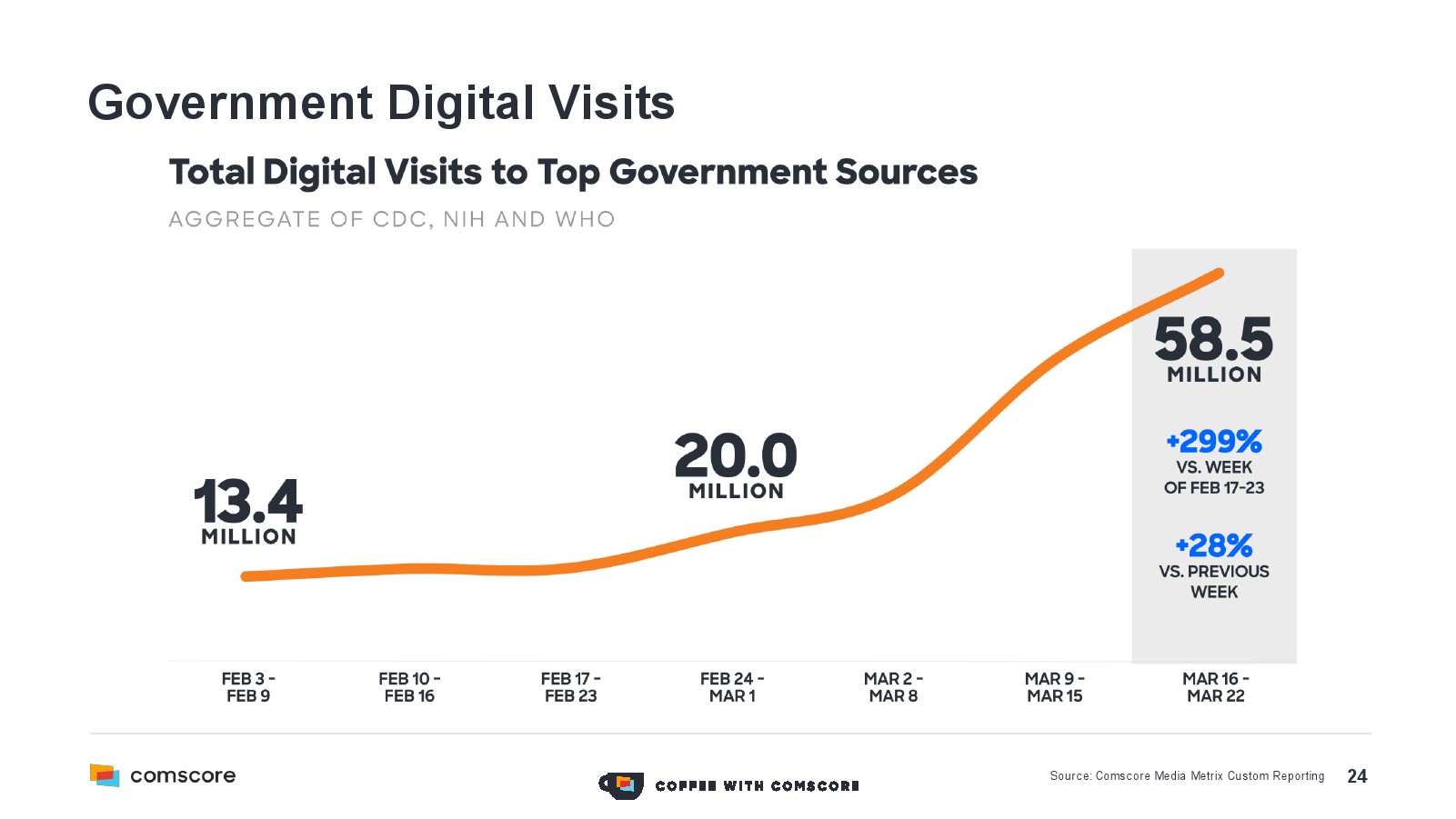 2020年3月16-22日,政府权威网站周访客数量达5850万人,比2月17-23日访客数量提高299%,比前一周访客数量提高28%。