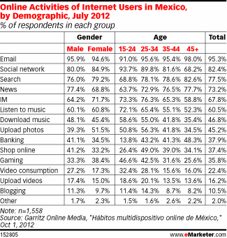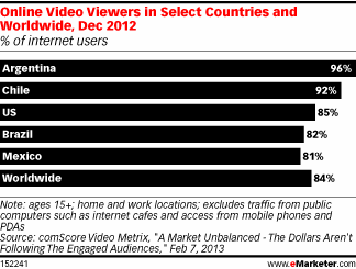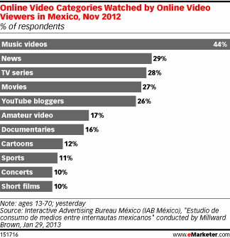 comScore在2013年2月的一份报告中估计,截至2012年12月,全墨西哥共有2300万网络视频观众。这一数据意味着该国网络视频观众的同比增长率接近10%,或者说从2011年12月至今,有200万互联网用户加入了墨西哥视频观众的大军。comScore估算认为,墨西哥的网络视频观众占到了全部网民的81%。其它的研究报告认为墨西哥的视频用户渗透率甚至更高。